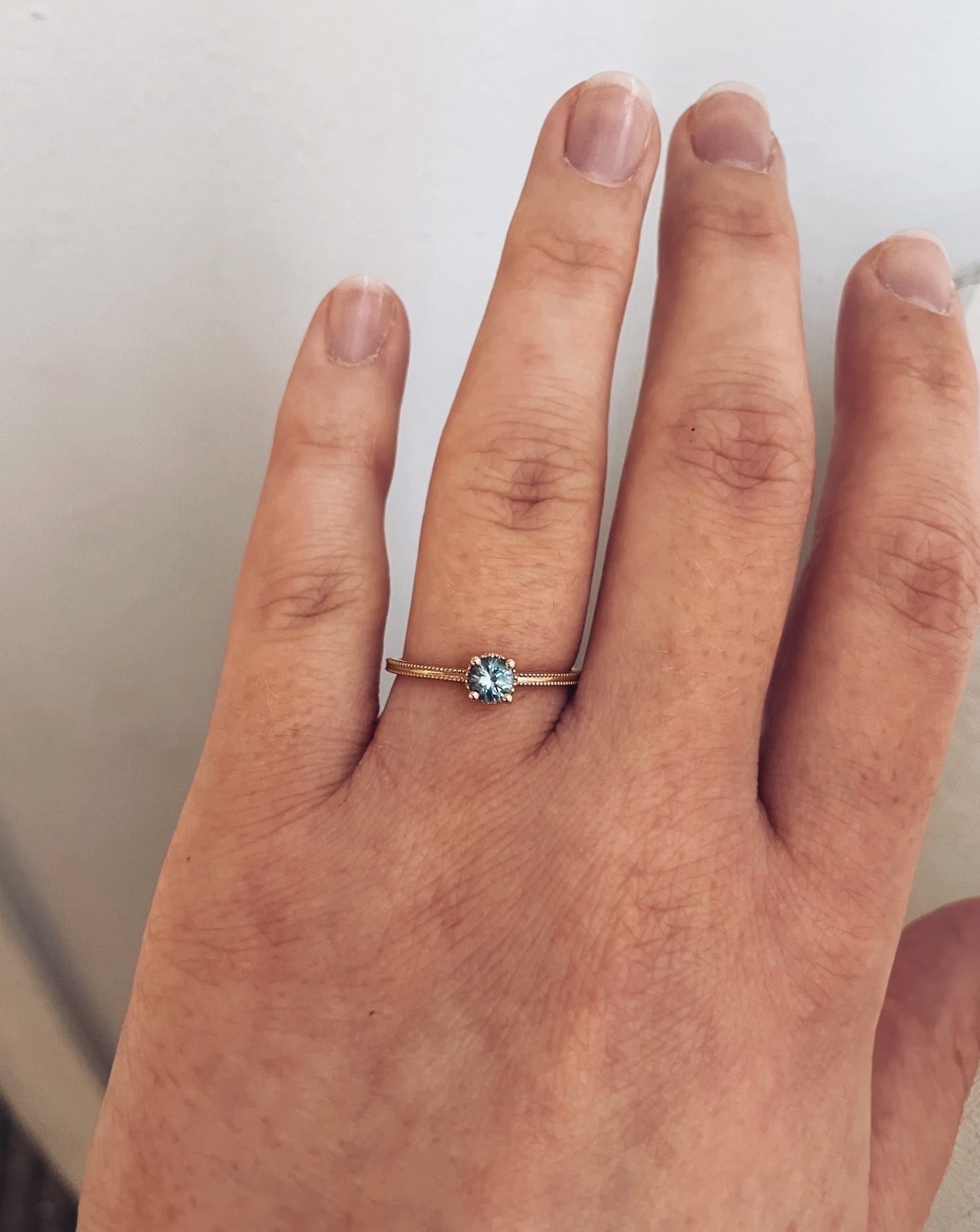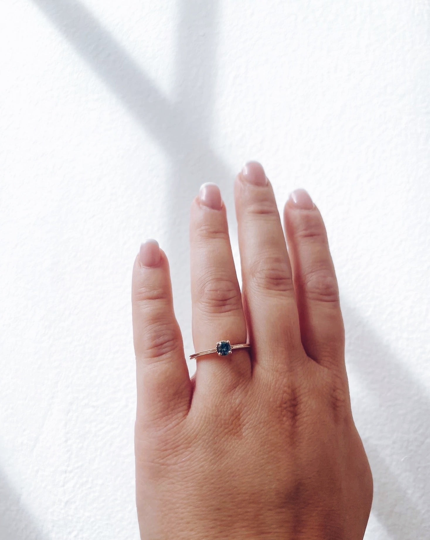 Sapphires come in many colors and hues ranging from dull to vivid, light to dark. In this ring we've used a sea blue sapphire.