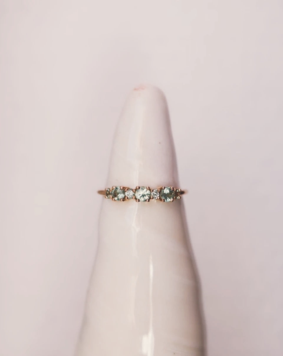This beautiful version of Brigitte Ring features rare olive green sapphires.
