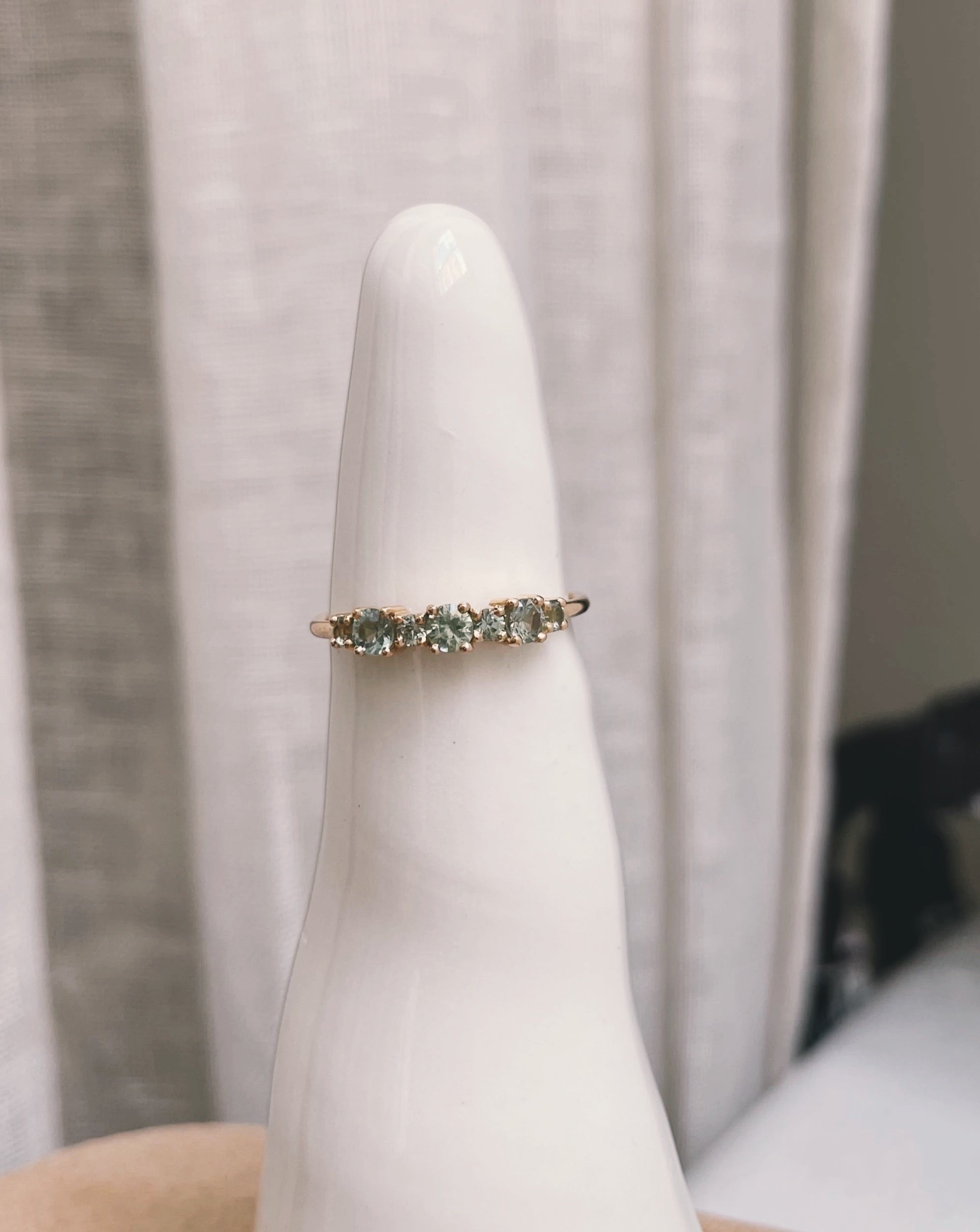 Three 3 mm (approx. 0.11 CT) & Four 2 mm (approx. 0.03 CT) Olive Green Sapphires.