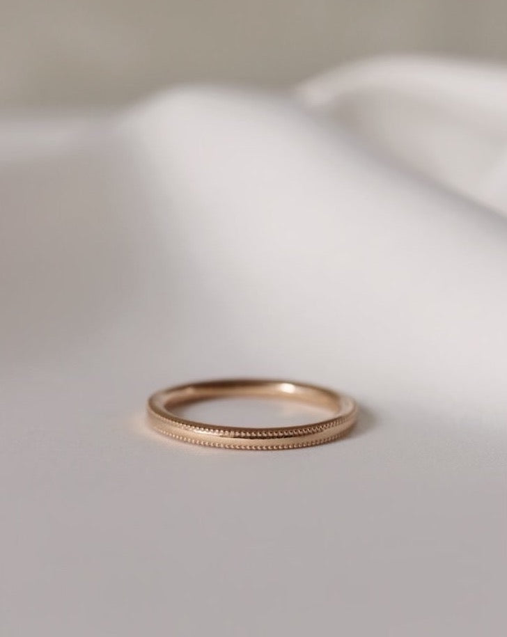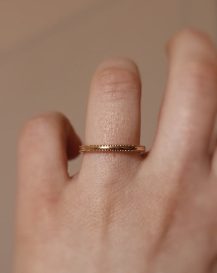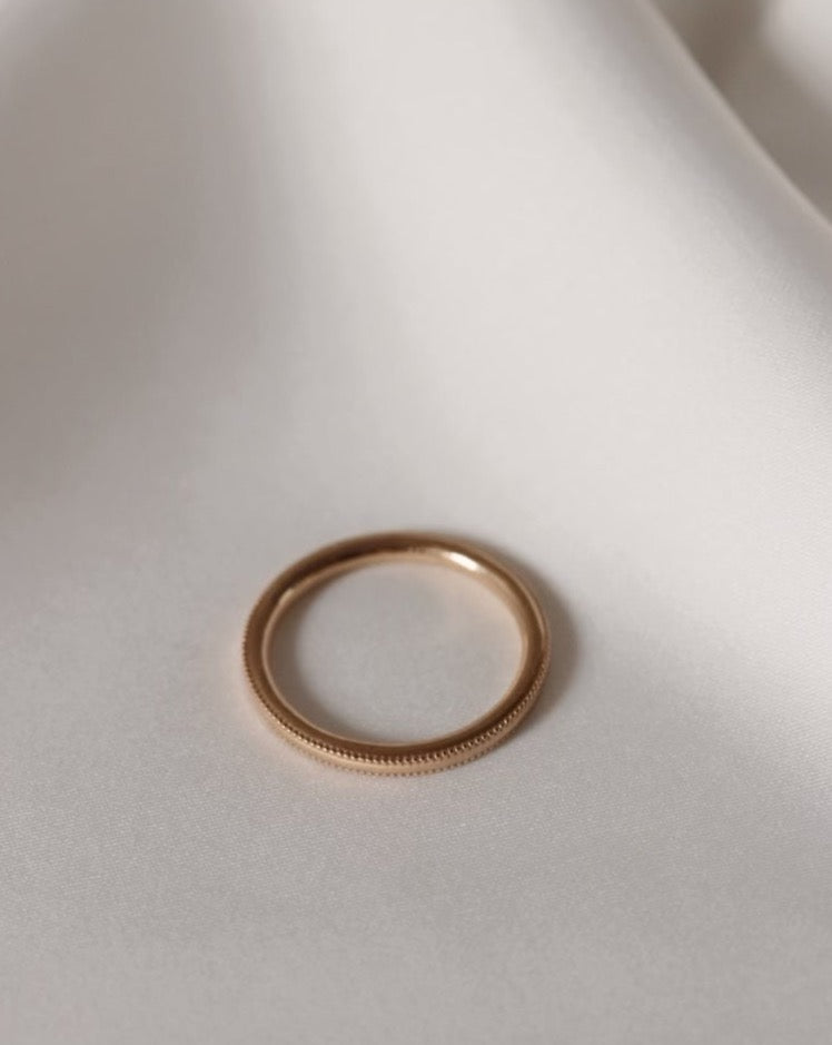 Vintage Gold Band was our first stone-less ring, and it quickly became such a cherished piece in our collection. The ring is adorned with tiny gold dots called milgrain, that was common in the beginning of 20th Century. This adds a beautiful and interesting vintage look to the ring.
