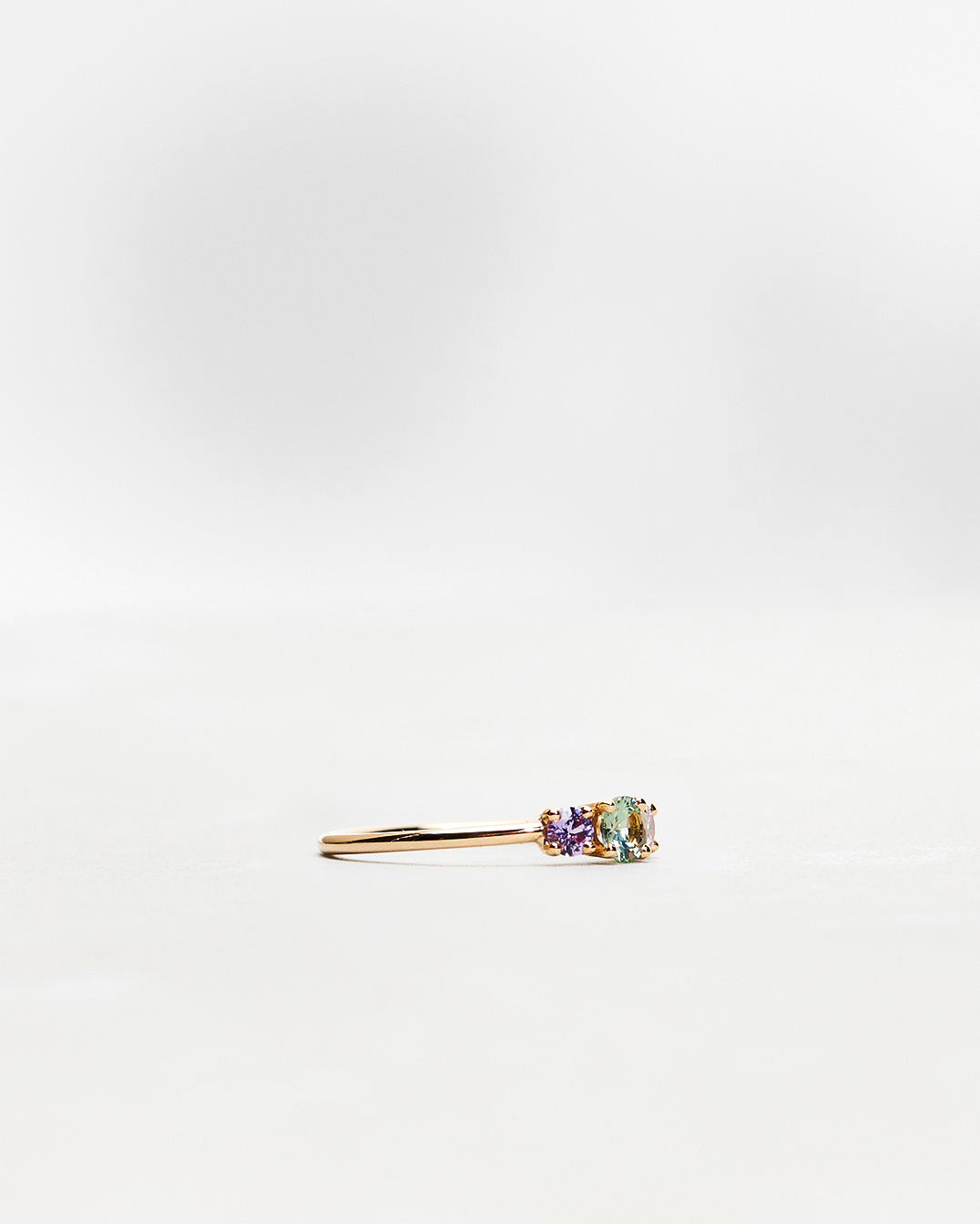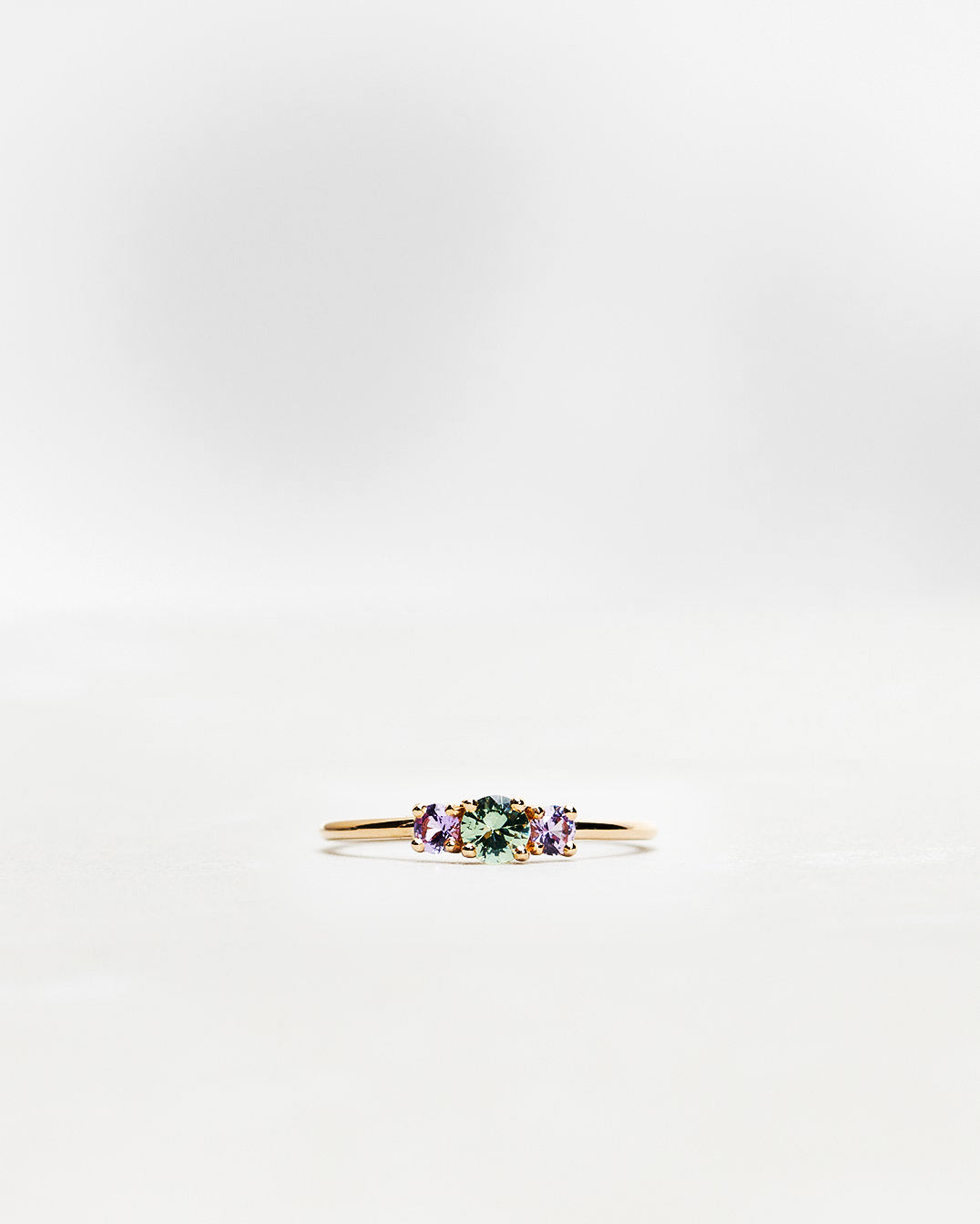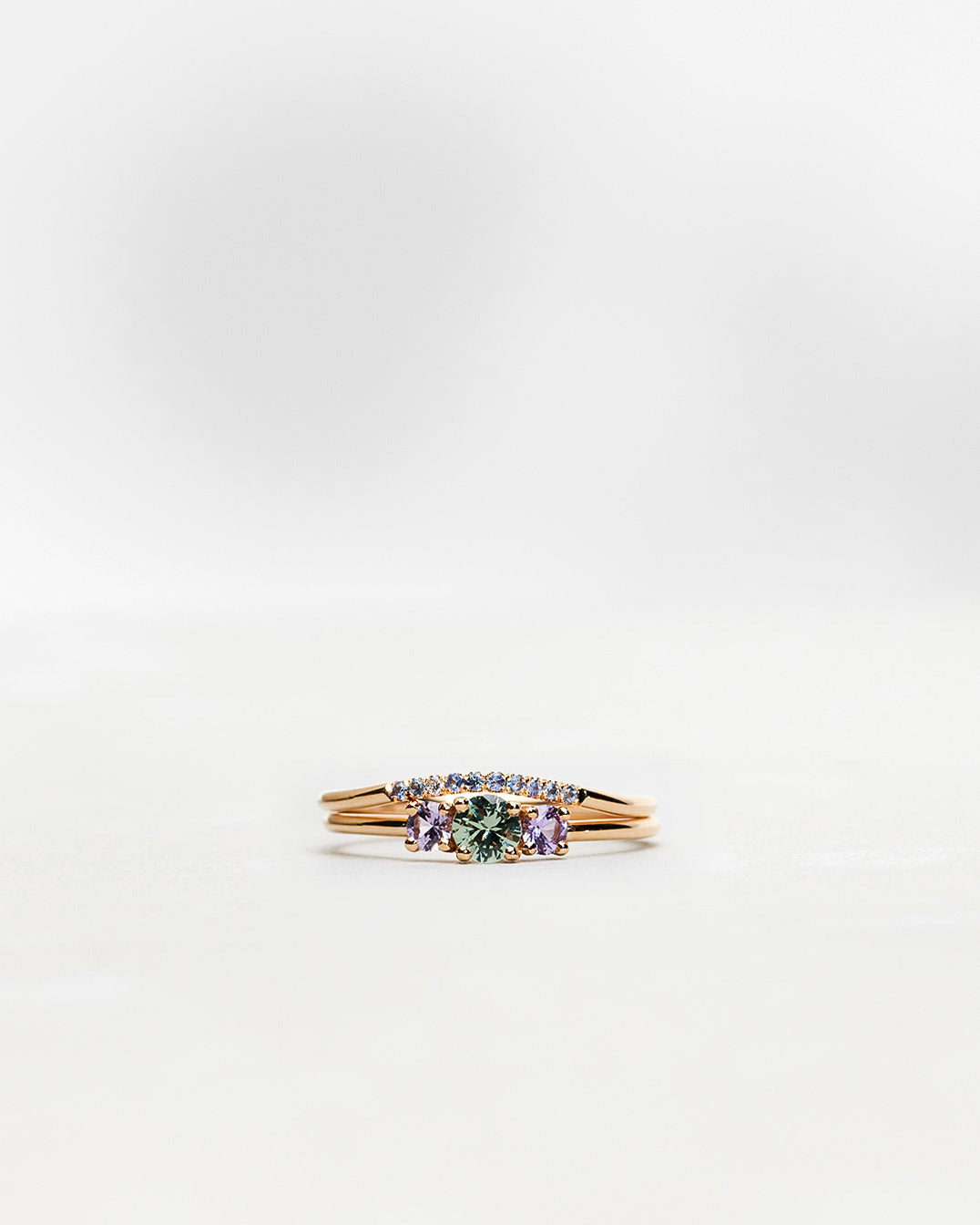 Edith Ring is one of our most loved rings. It's a classic three-stone ring in a minimalist, modern design. Here in a lovely new color combination with one olive green and two lavender sapphires.