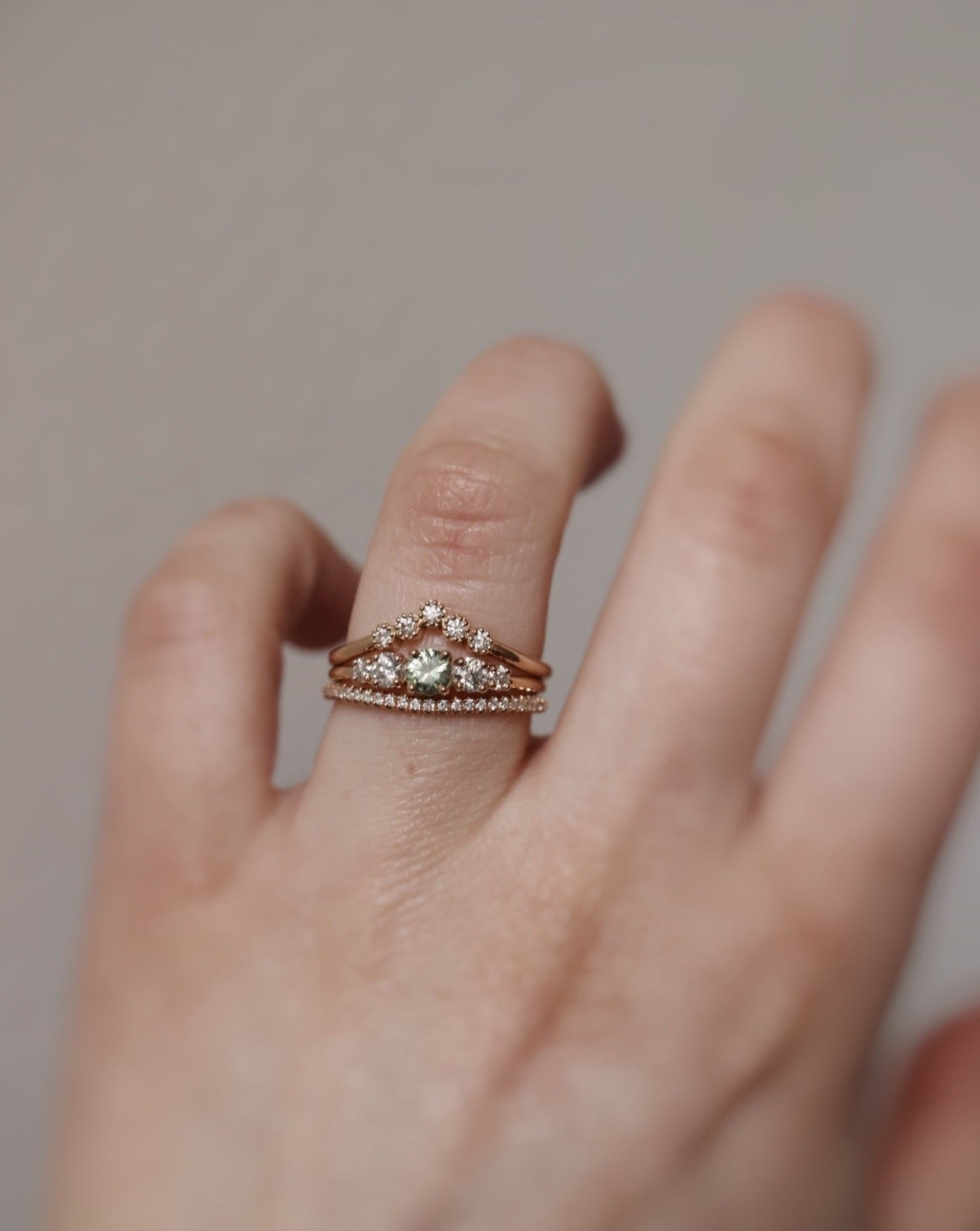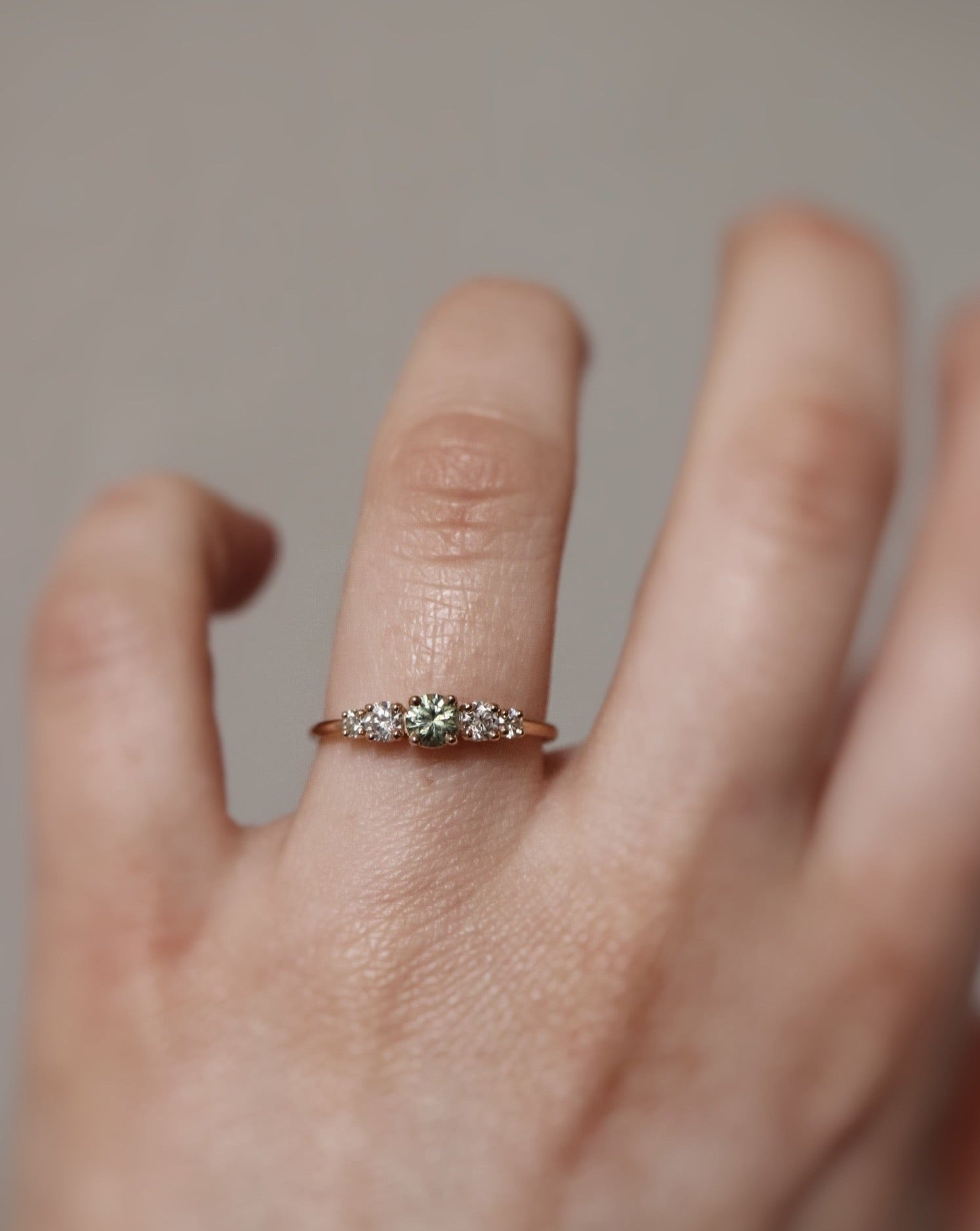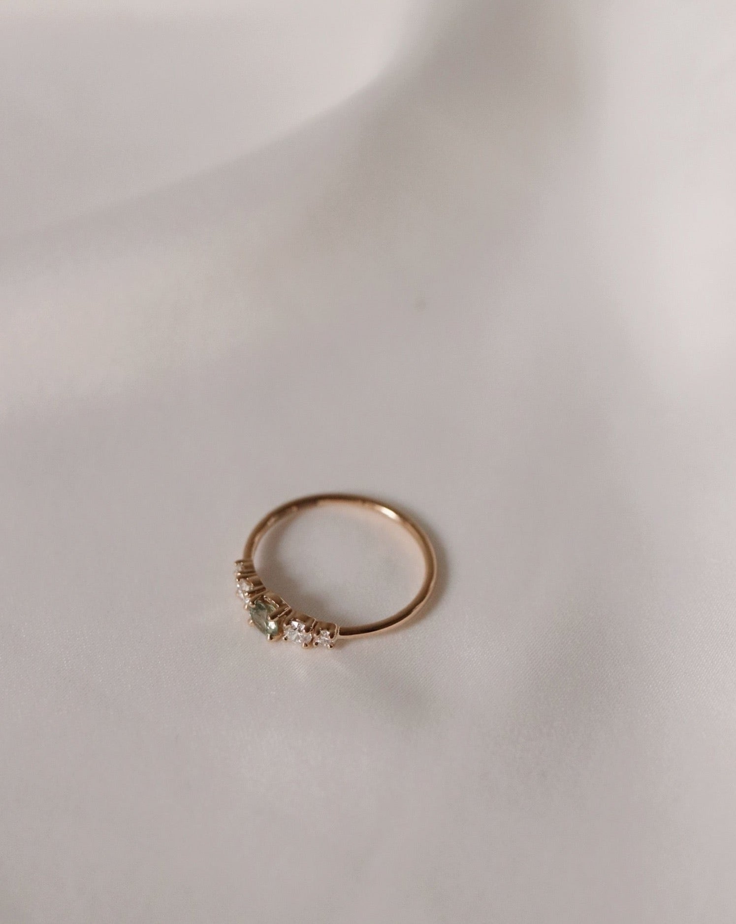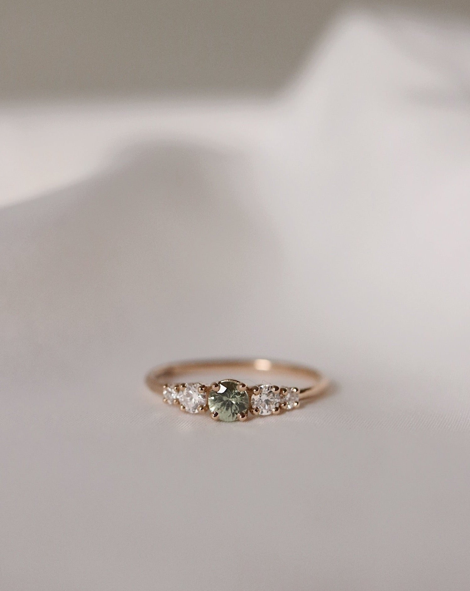 Here we've made the ring with sparkling diamonds, paired with a sapphire in a signature Mumbaistockholm color; our popular olive green shade!