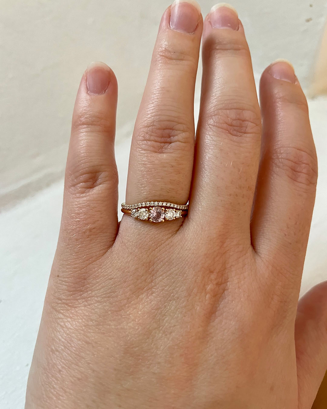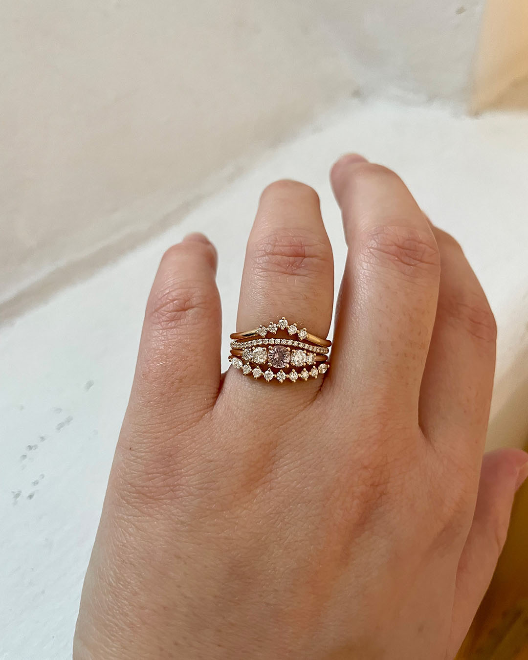 Elise Ring looks amazing alone on the ring finger. It also stacks beautifully with all curved bands.