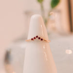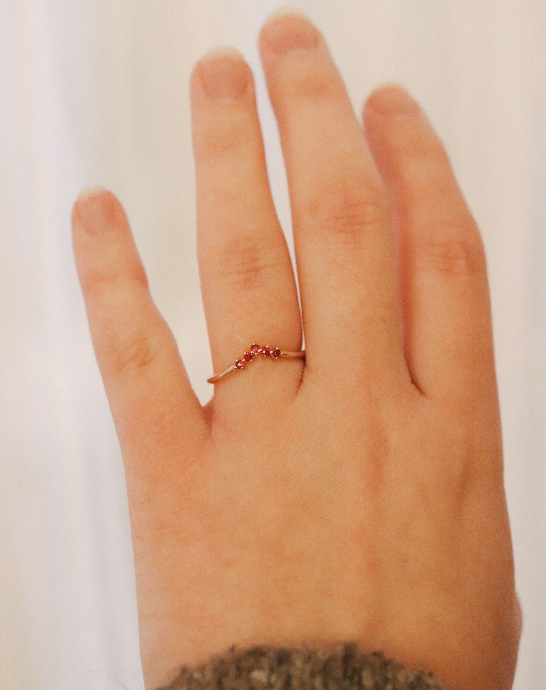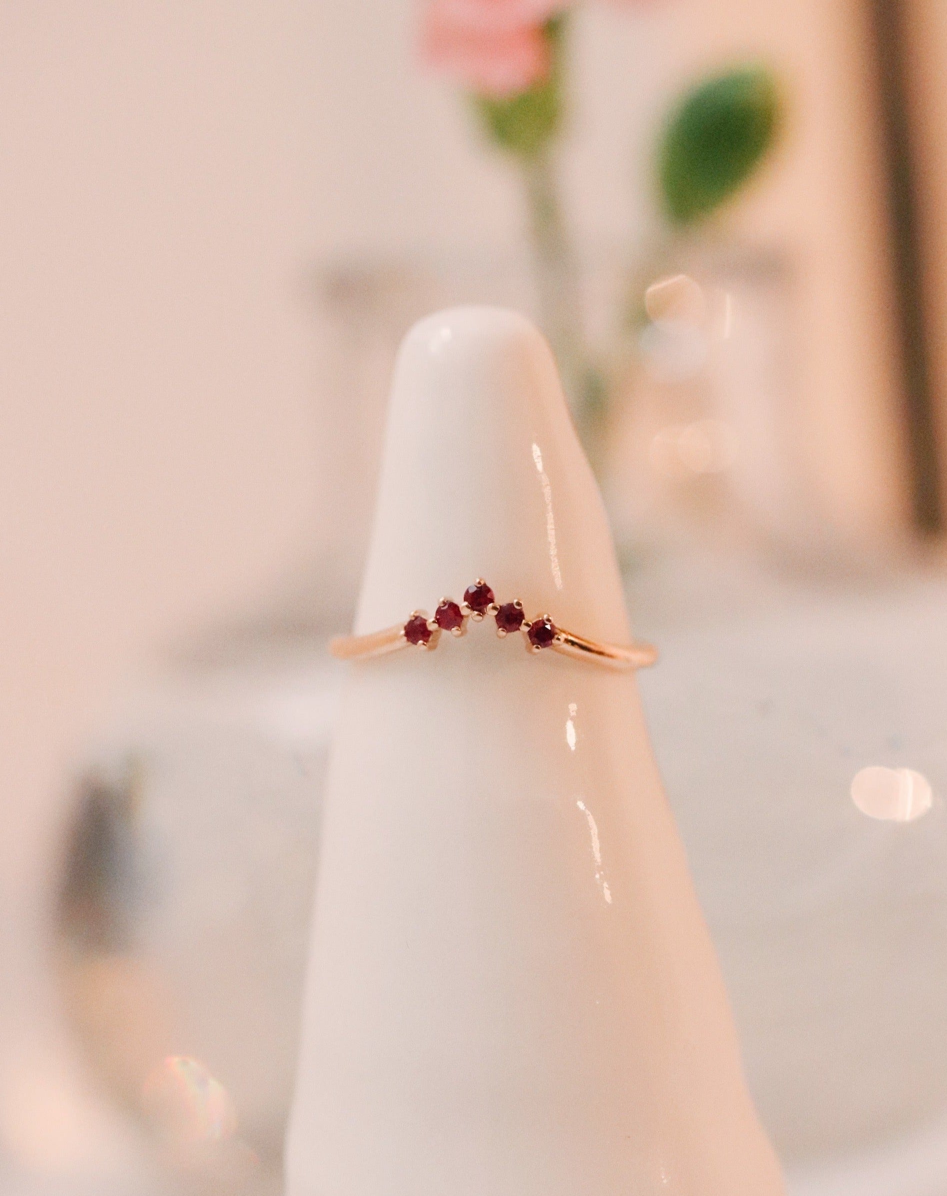 Here we have combined the beautiful design of Five Diamond Triangle Ring with the luxurious feel of red rubies. An exquisite pairing that makes for an elegant and special ring.