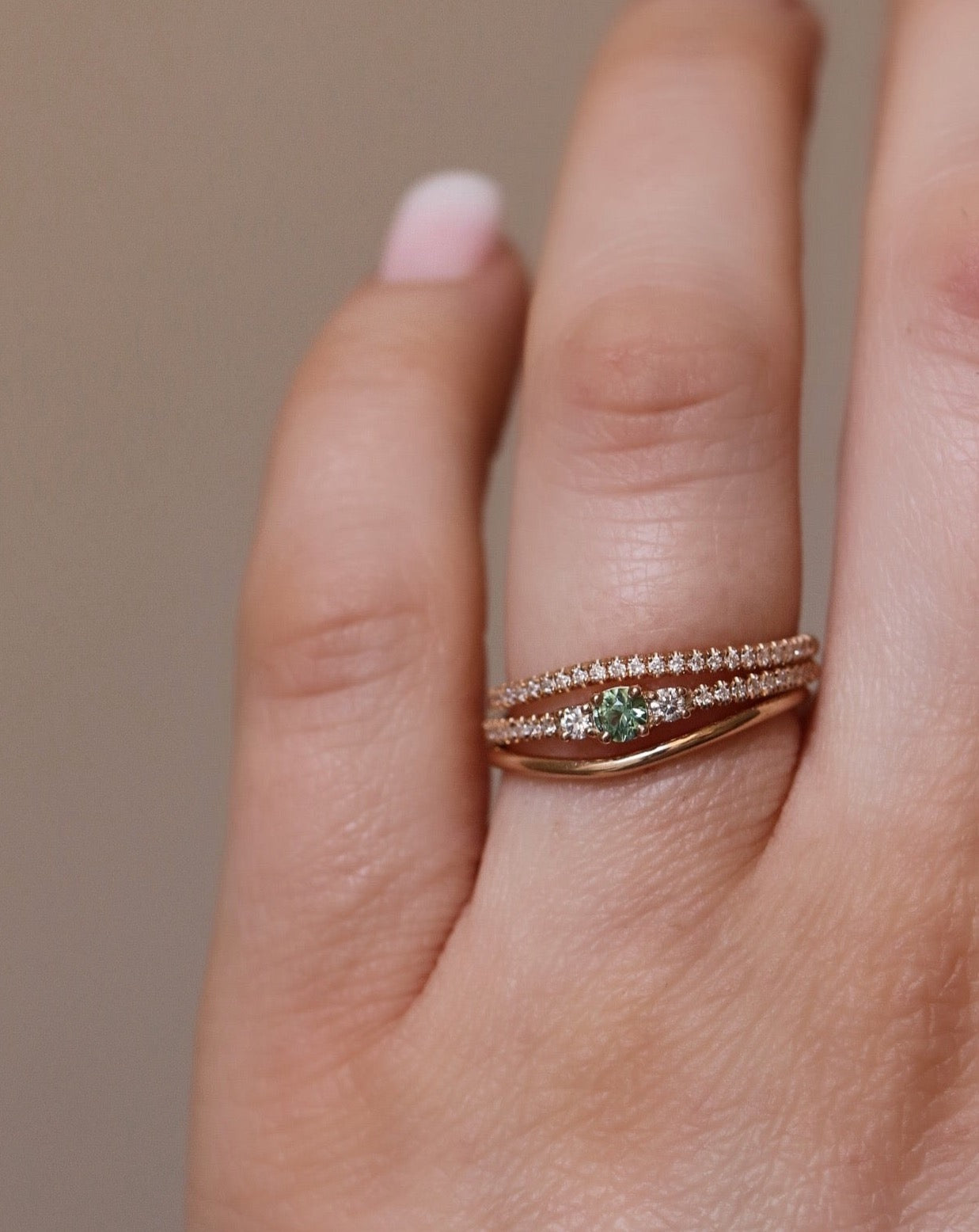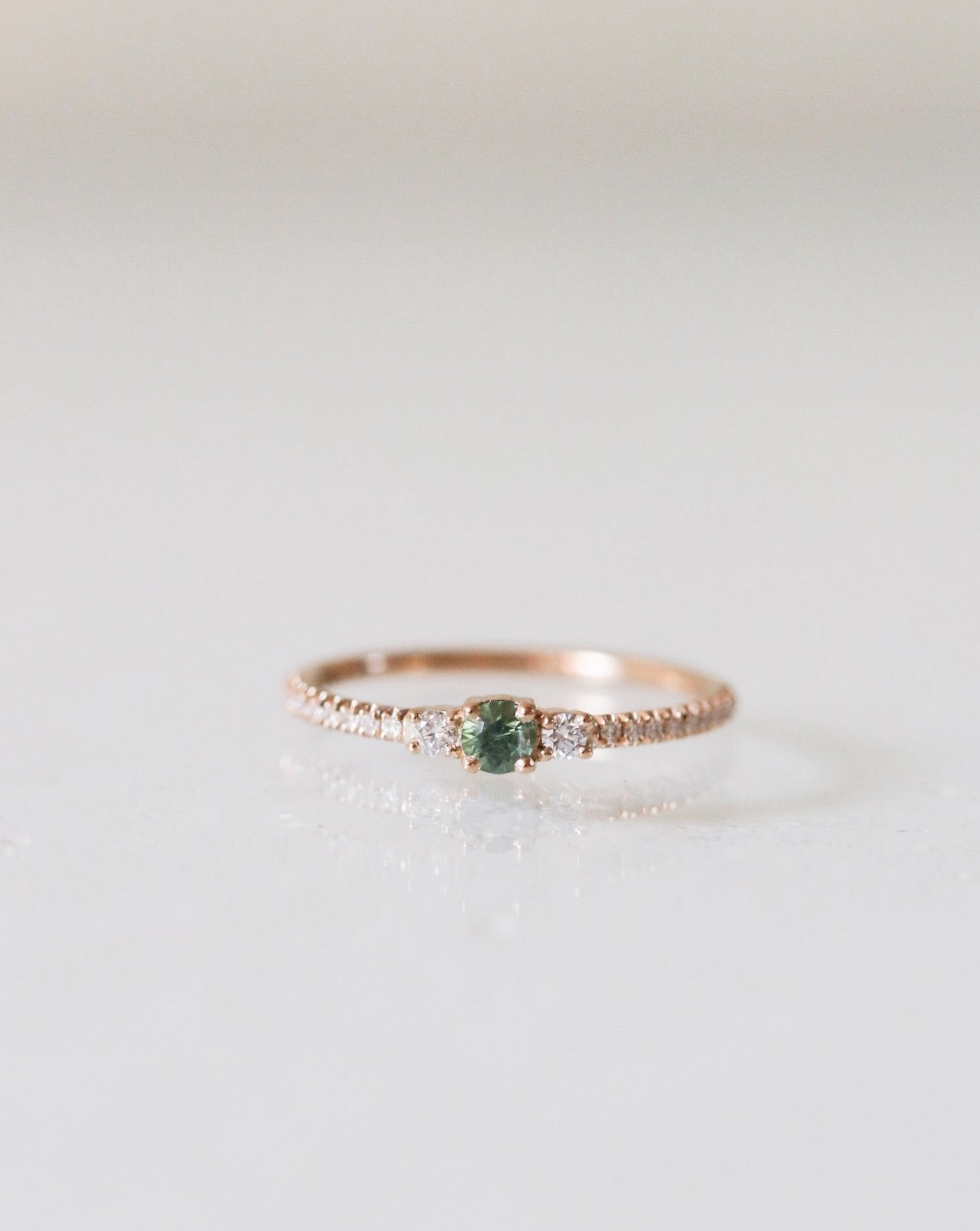Sapphires come in many colors and hues ranging from dull to vivid, light to dark. In this ring we've used a beautiful light green sapphire.