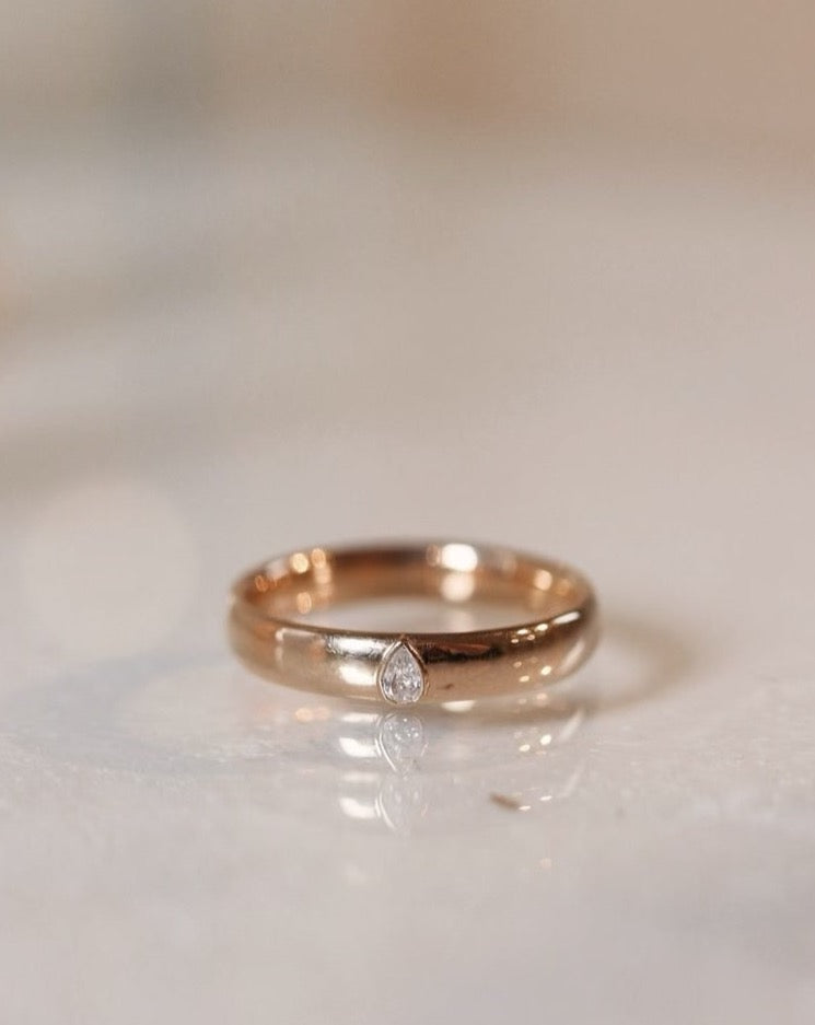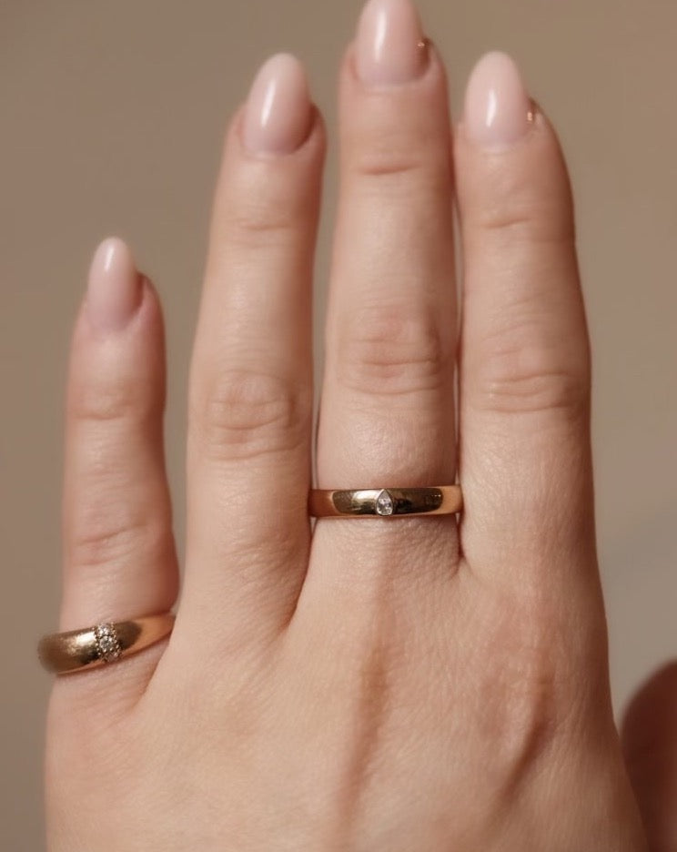 Hidden Gem Drop Ring has a slightly domed band that gives the ring a soft look and makes it incredibly comfortable to wear. Wear it alone, or mix it with other Mumbaistockholm pieces. The contrast between our other petite bands and this slightly wider model makes for an exquisite pairing.