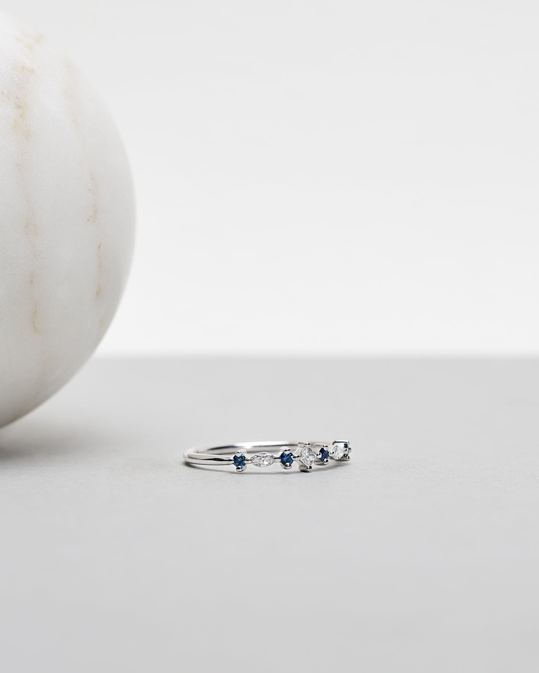 Hilda Ring has a lovely vintage feel. The design includes squared princess cut, boat-shaped marquise cut and round brilliant cut gemstones. This white gold version features a combination of blue sapphires and white diamonds.