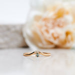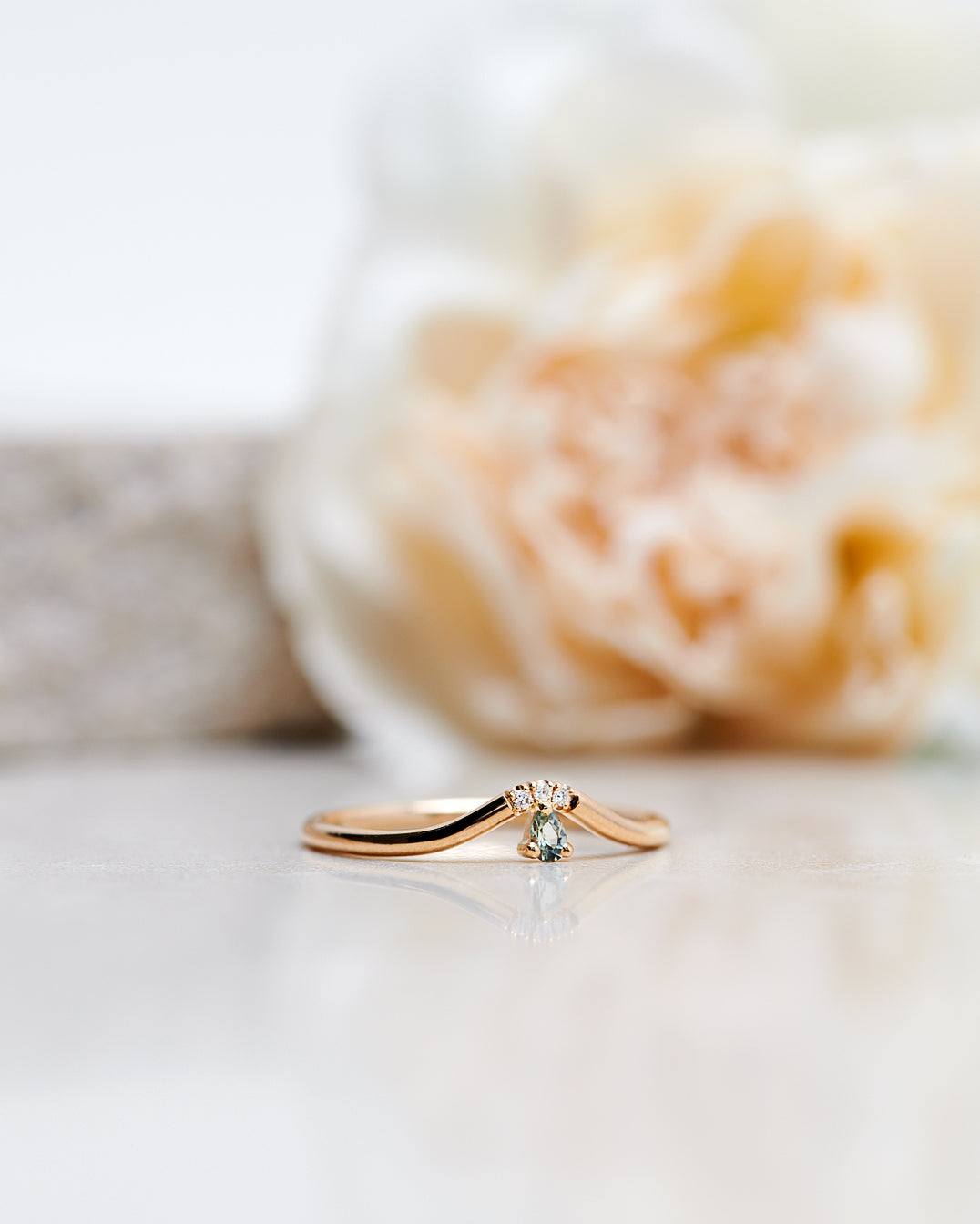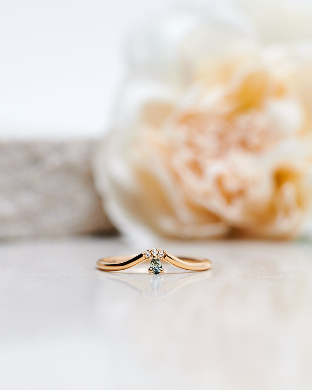 In this version of the Lily Fallen Drop Ring we've used a rare olive green sapphire drop combined with three diamonds to really enhance the colour of the sapphire! The sapphire drop "falls" from the top, where the three brilliant diamonds shine.