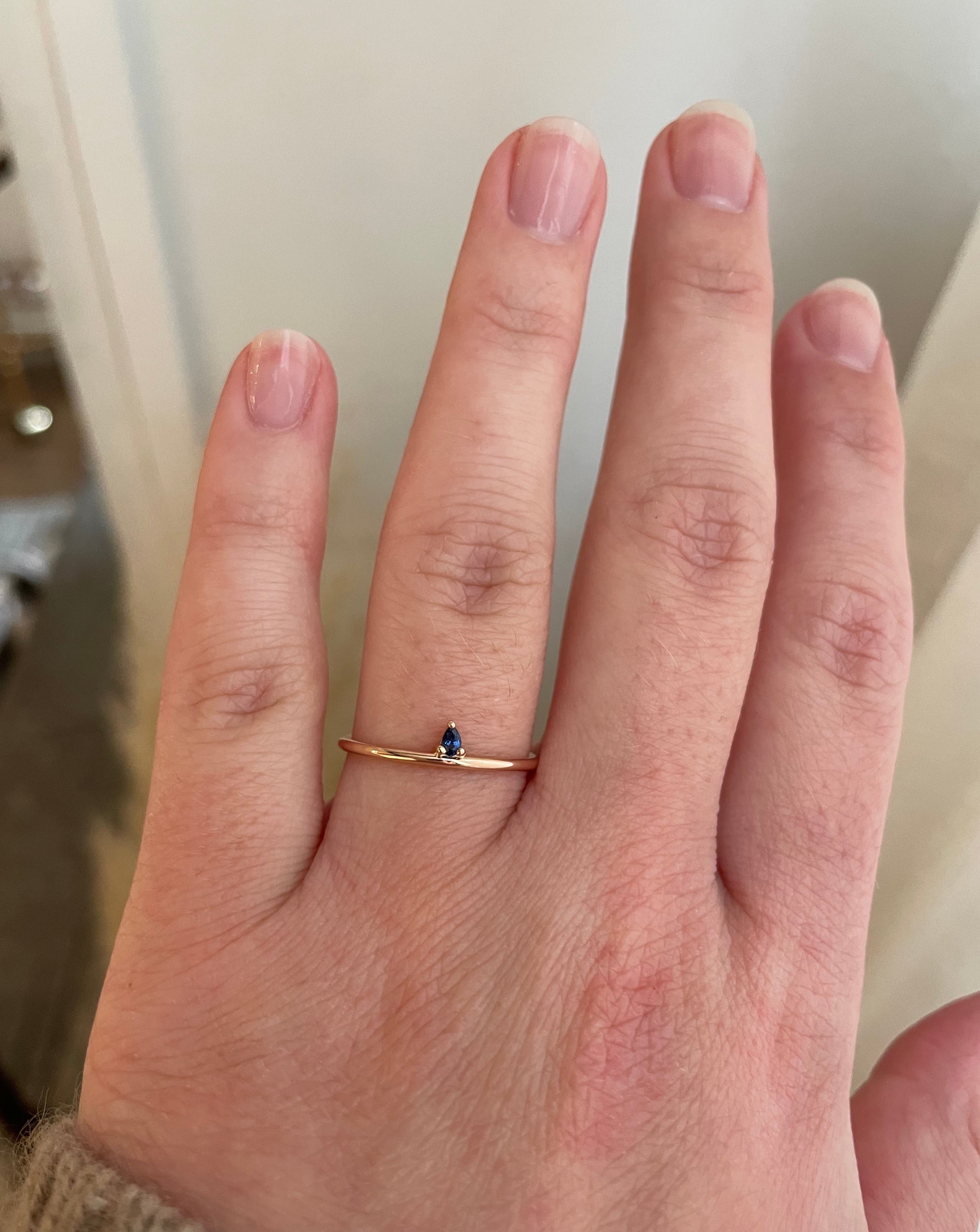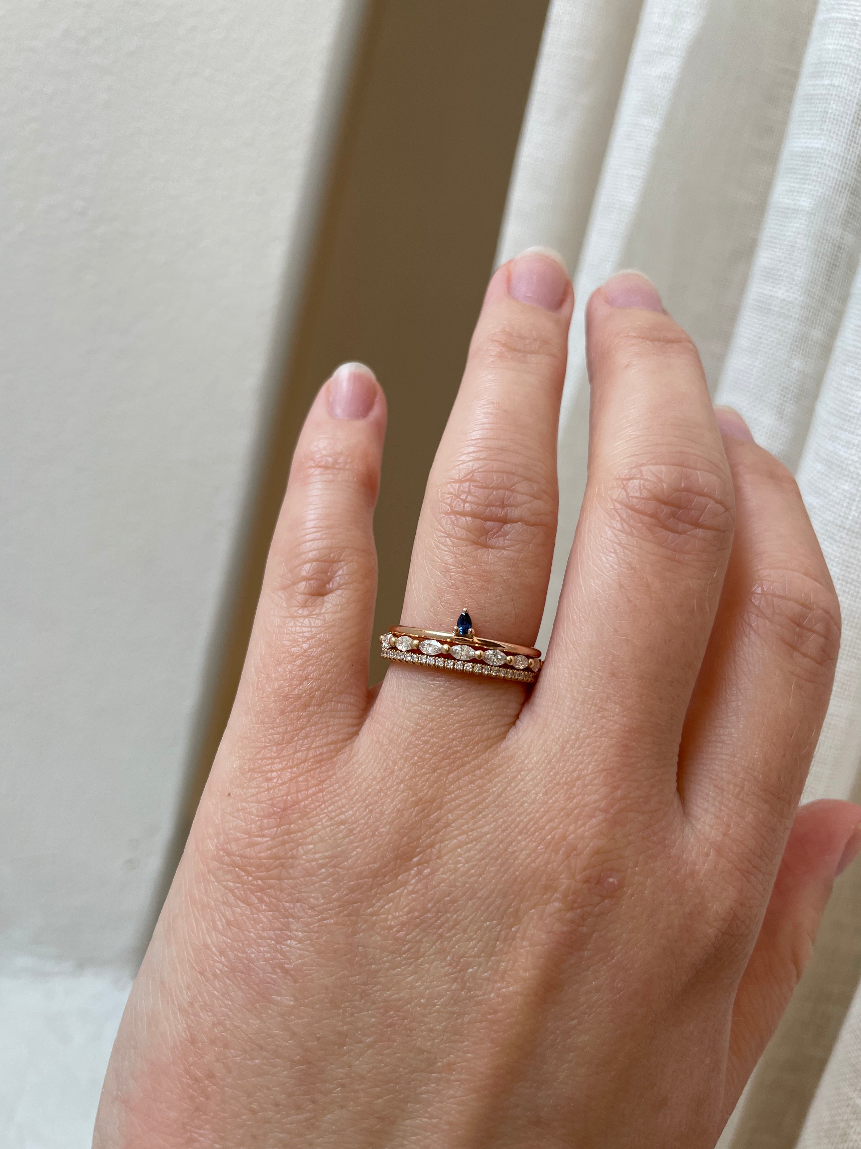 In this ring we have used a dark blue sapphire drop that perfectly compliment the soft rose gold color of the band.