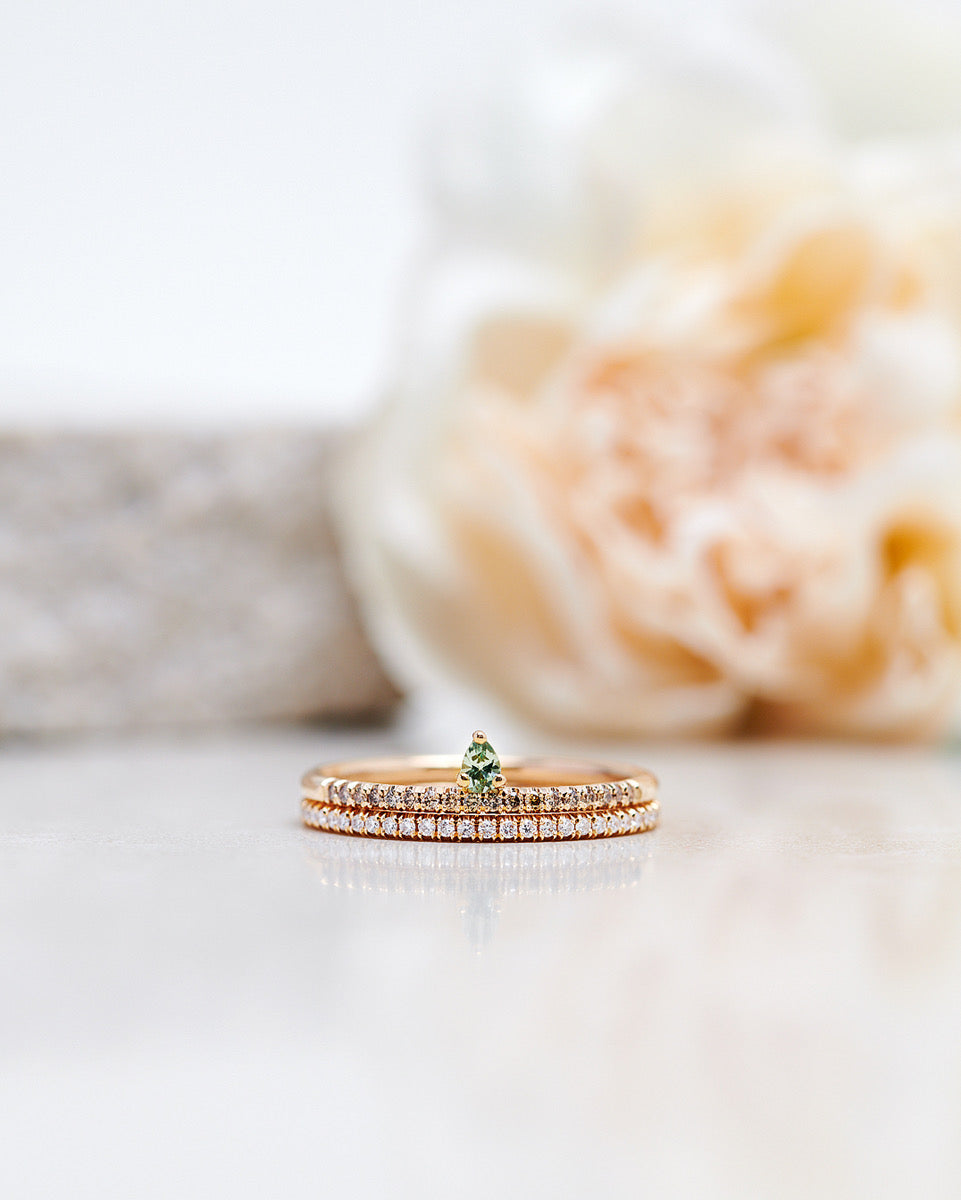 In this version of the Lily Tiny Drop Ring we've used a rare olive green sapphire drop combined with chocolate diamonds to give the ring some extra sparkle. Olive green and chocolate has for a long time been one of our most popular colour combinations, and we can really see why!
