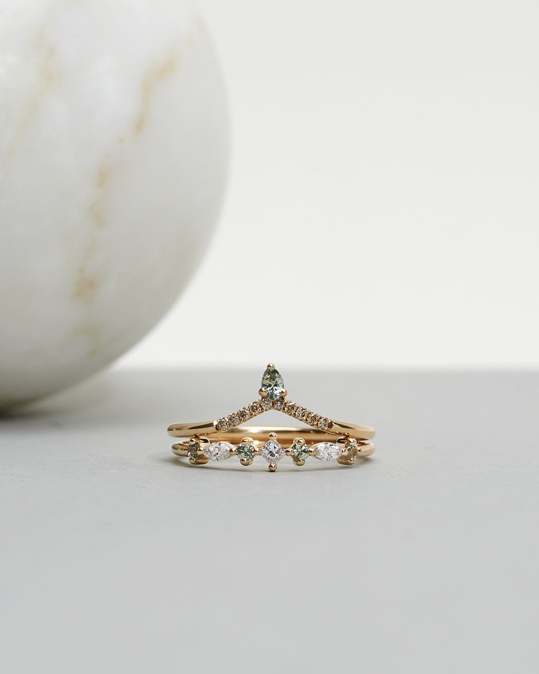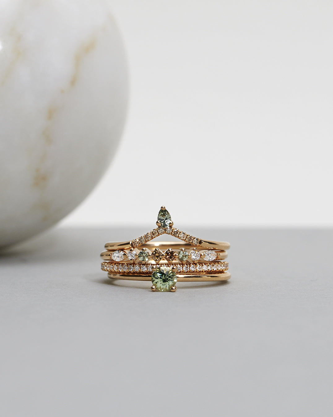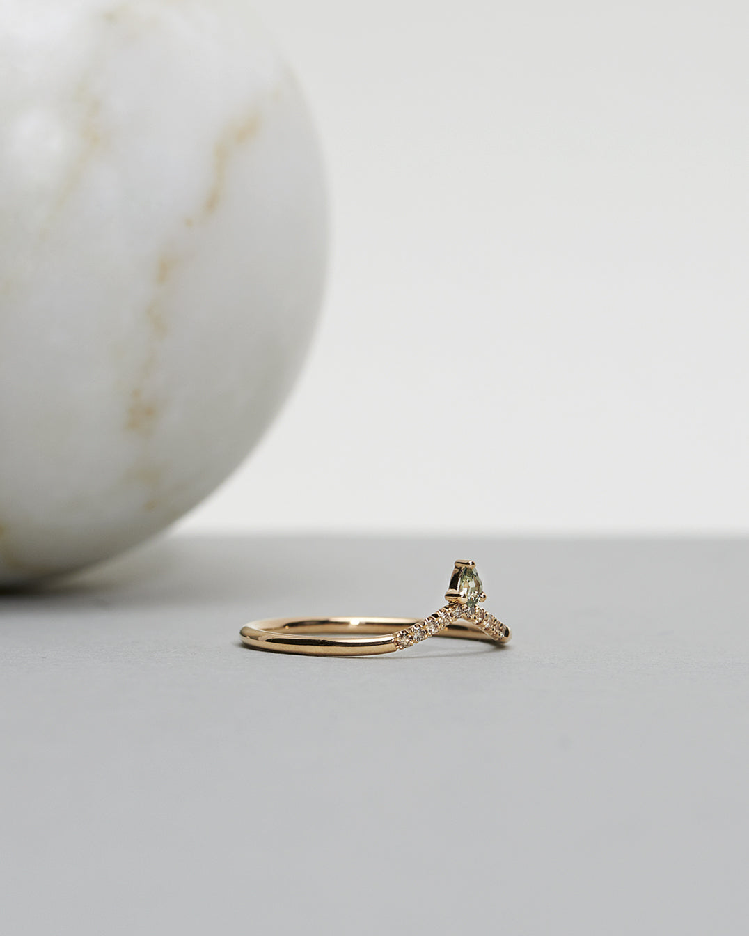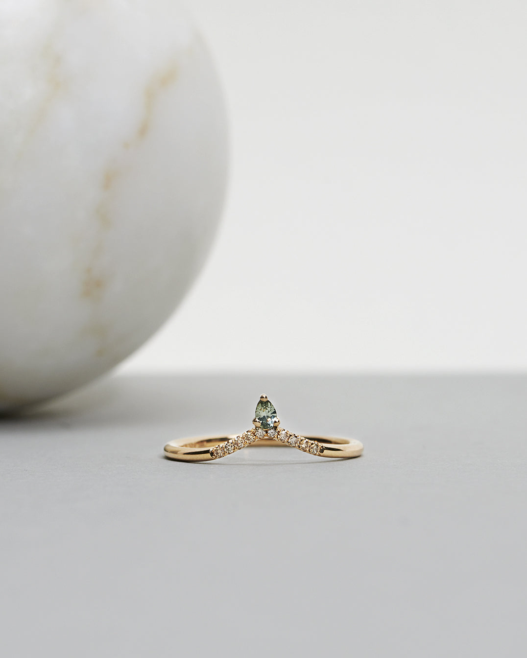 In this version of the Lily Top Drop Sparkle Ring we've used a rare olive green sapphire drop combined with chocolate diamonds for a soft sparkle. Olive green and chocolate has for a long time been one of our most popular color combinations, and we can really see why!