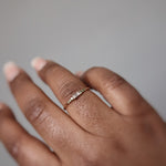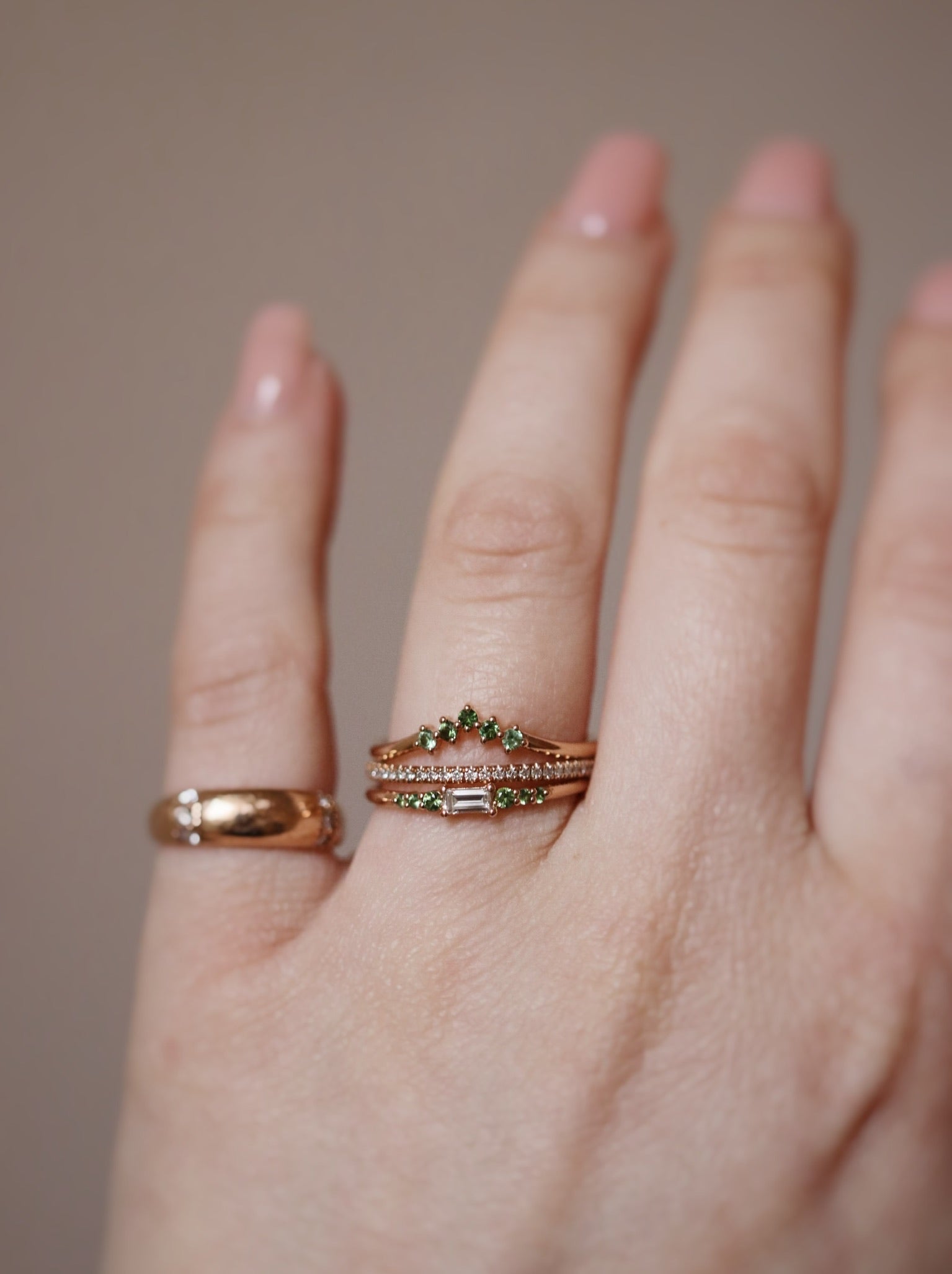 This ring is beautiful worn alone on the ring finger or middle finger. It also stacks wonderfully with a curved band or a thin plain gold band.