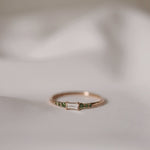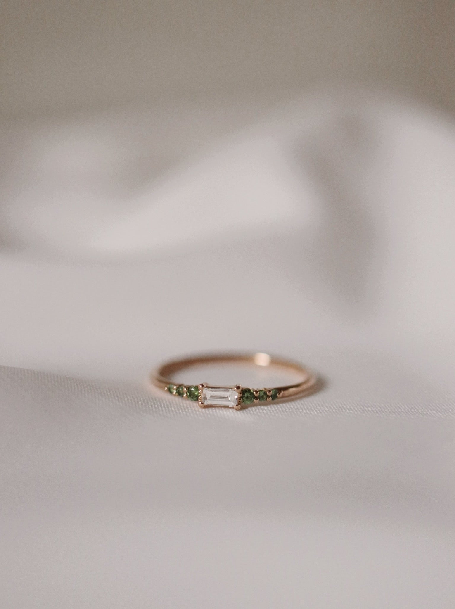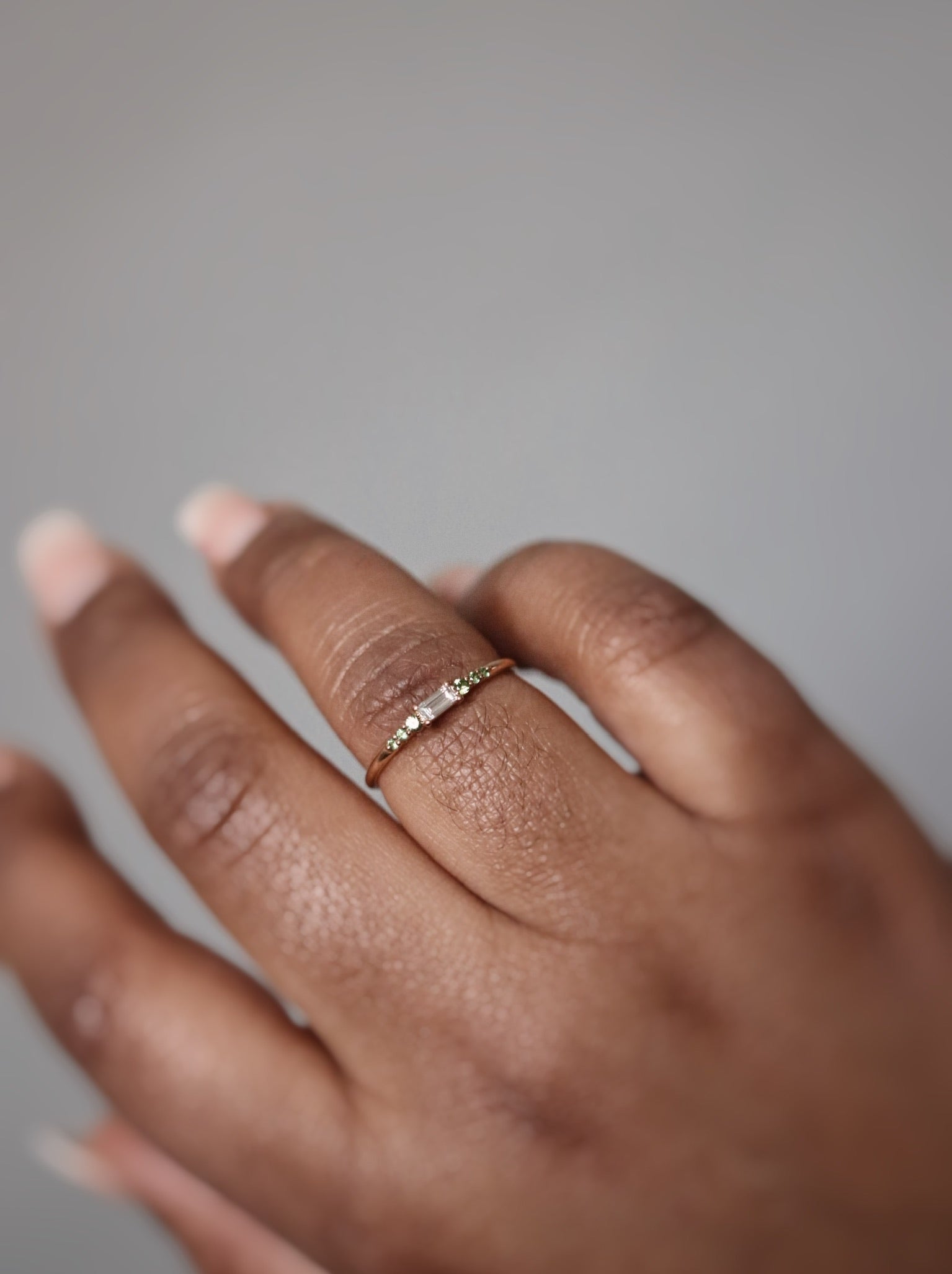 Finished: Mini Baguette Brilliant Diamond Cluster Ring with Baguette Diamond and Light Green Tourmalines