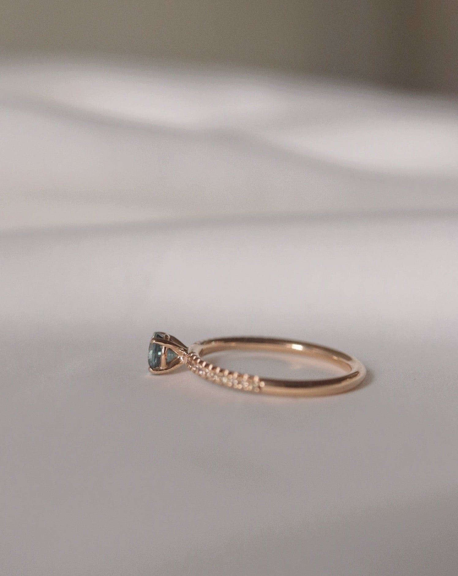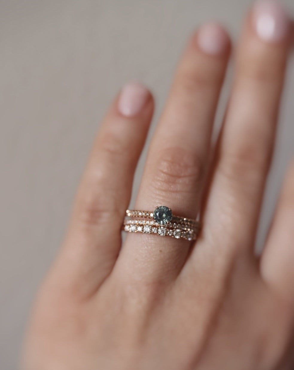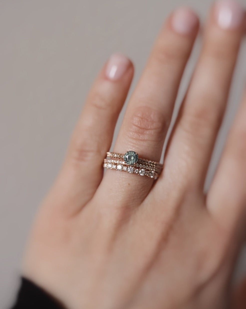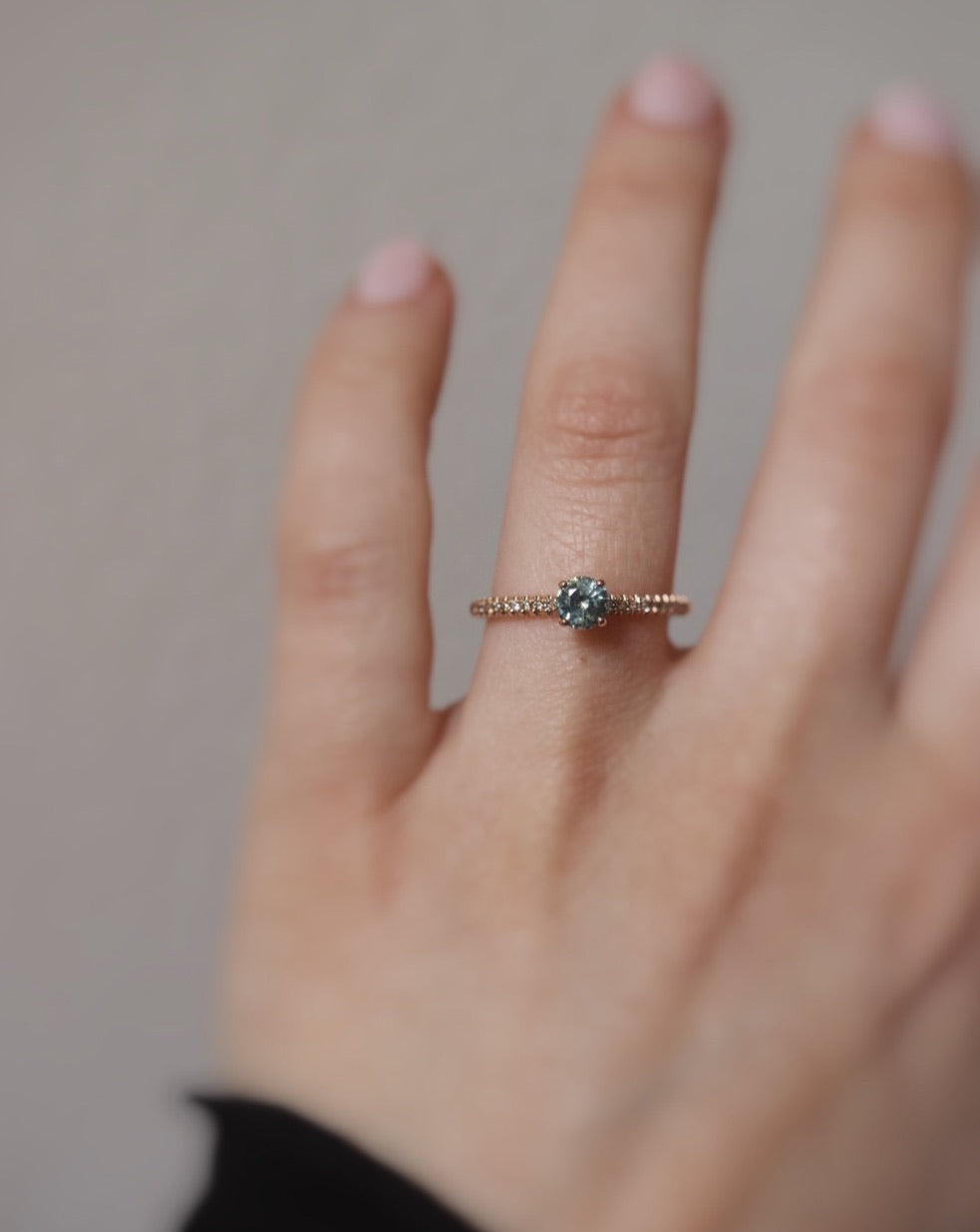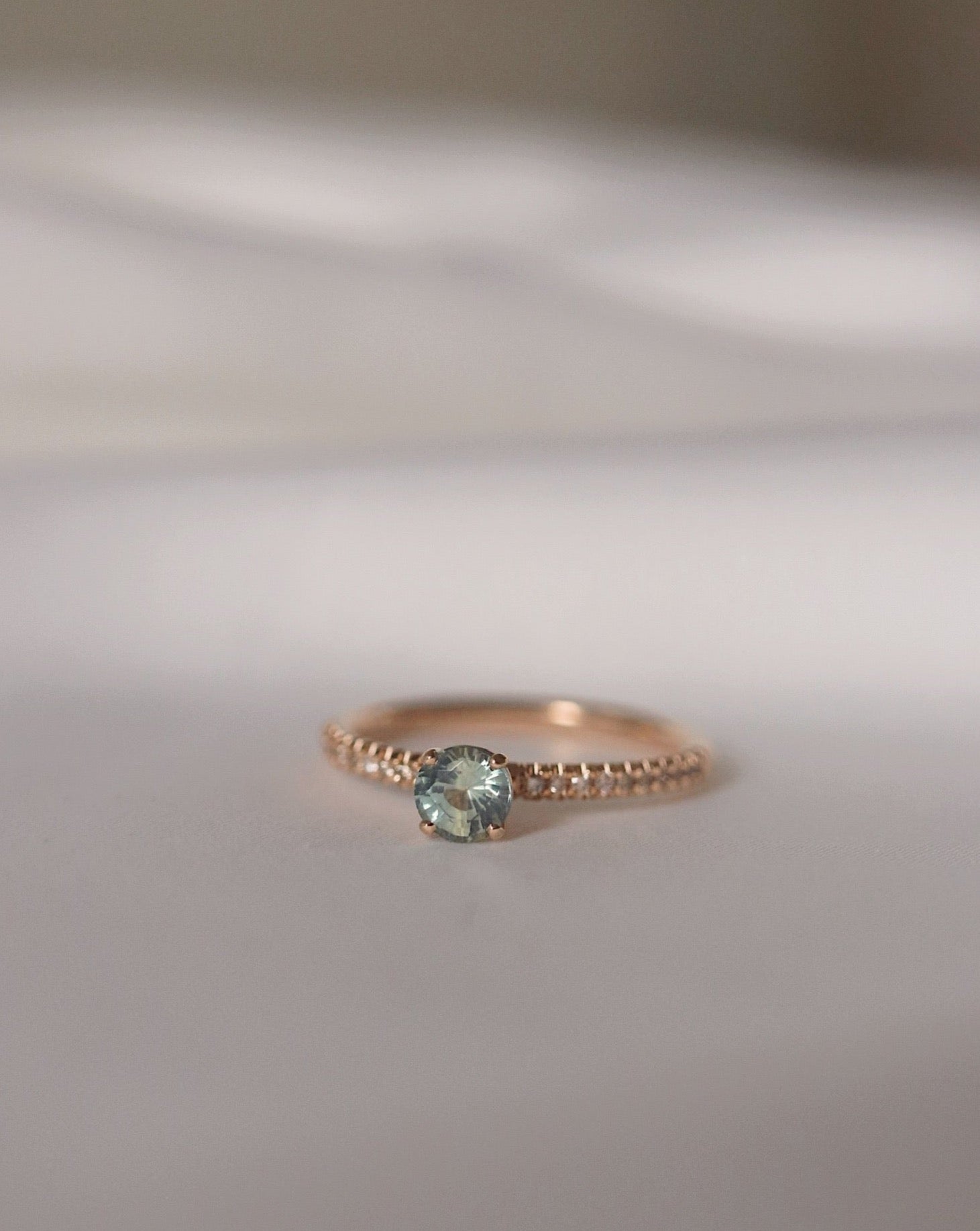 Green sapphires come in many hues ranging from dull to vivid, light to dark. In this ring we've used a beautiful bluish olive green shade from Northern Madagascar.