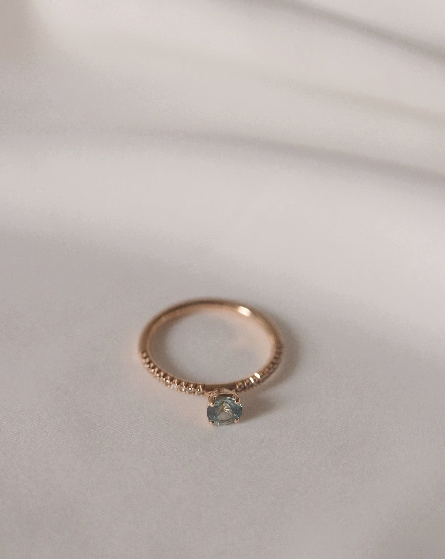 Set in this ring we have an absolutely stunning olive green sapphire with clear blue undertones, that originates from Madagascar. To further accentuate the sapphire we have set sparkling champagne diamonds in the band, giving this ring a soft color palette.