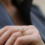 Topasen är en hållbar ädelsten tack vare dess hårdhet, men på grund av sin molekylära uppbyggnad har den en annan svaghet: den chippas lättare i kanten än andra stenar med liknande hårdhet som turmaliner eller morganiter. Därför bör du vara försiktig så du inte slår emot din ring i hårda föremål.