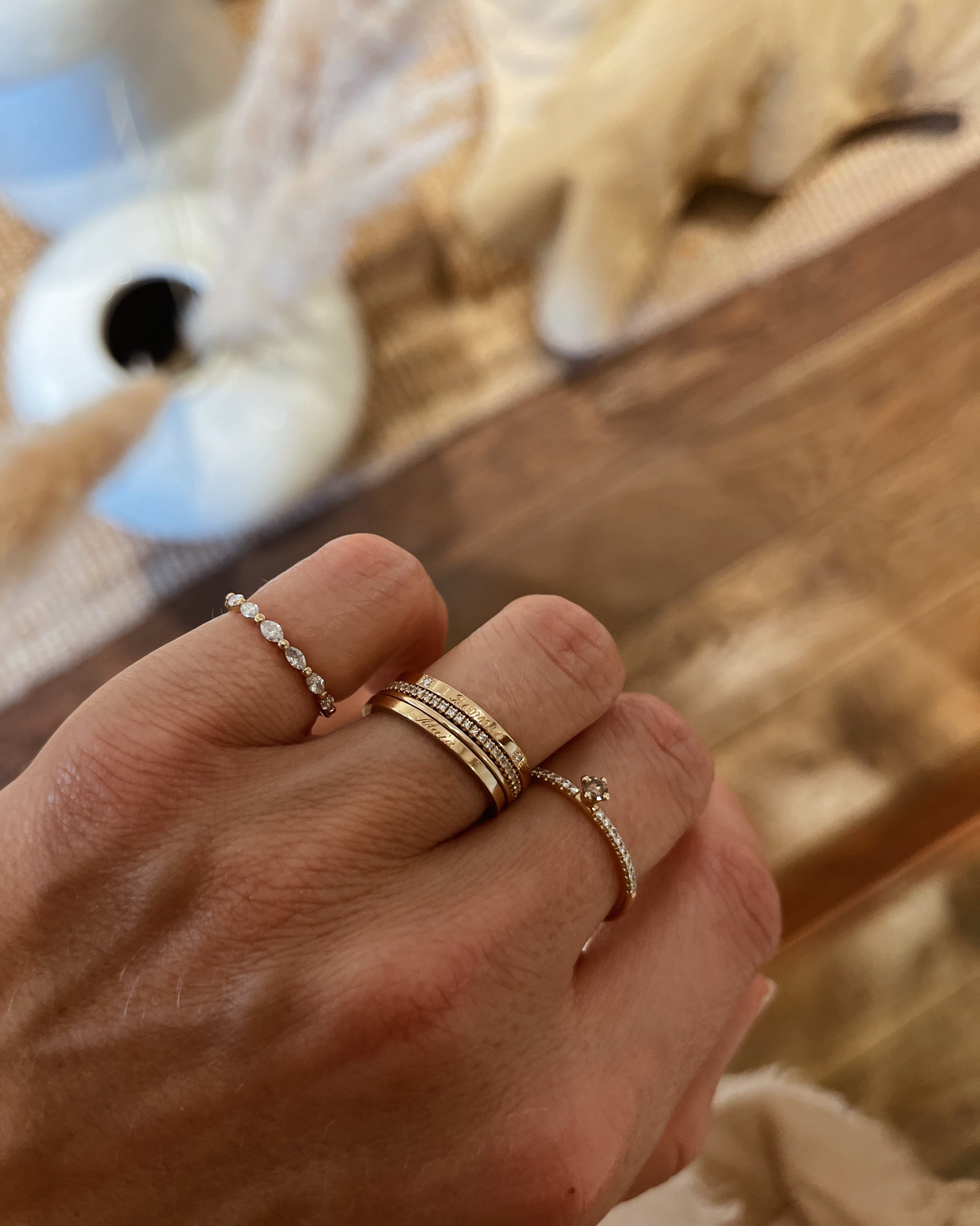 En mycket tunn ring som är särskilt designad för att vara en vad jag kallar "distansring" i en ringstack. Den är perfekt för att skapa mellanrum mellan två andra ringar med ädelstenar, så att varje ring förhöjs och får skina.