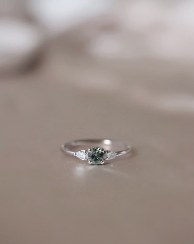 A thyme green sapphire and two drop diamonds, clear as water drops. A unique engagement ring for a down-to-earth mumbai girl in Gothenburg. So beautiful! I want a herb garden and the sea on my finger too. Thank you for letting us create this ring for you Hanna. ♡