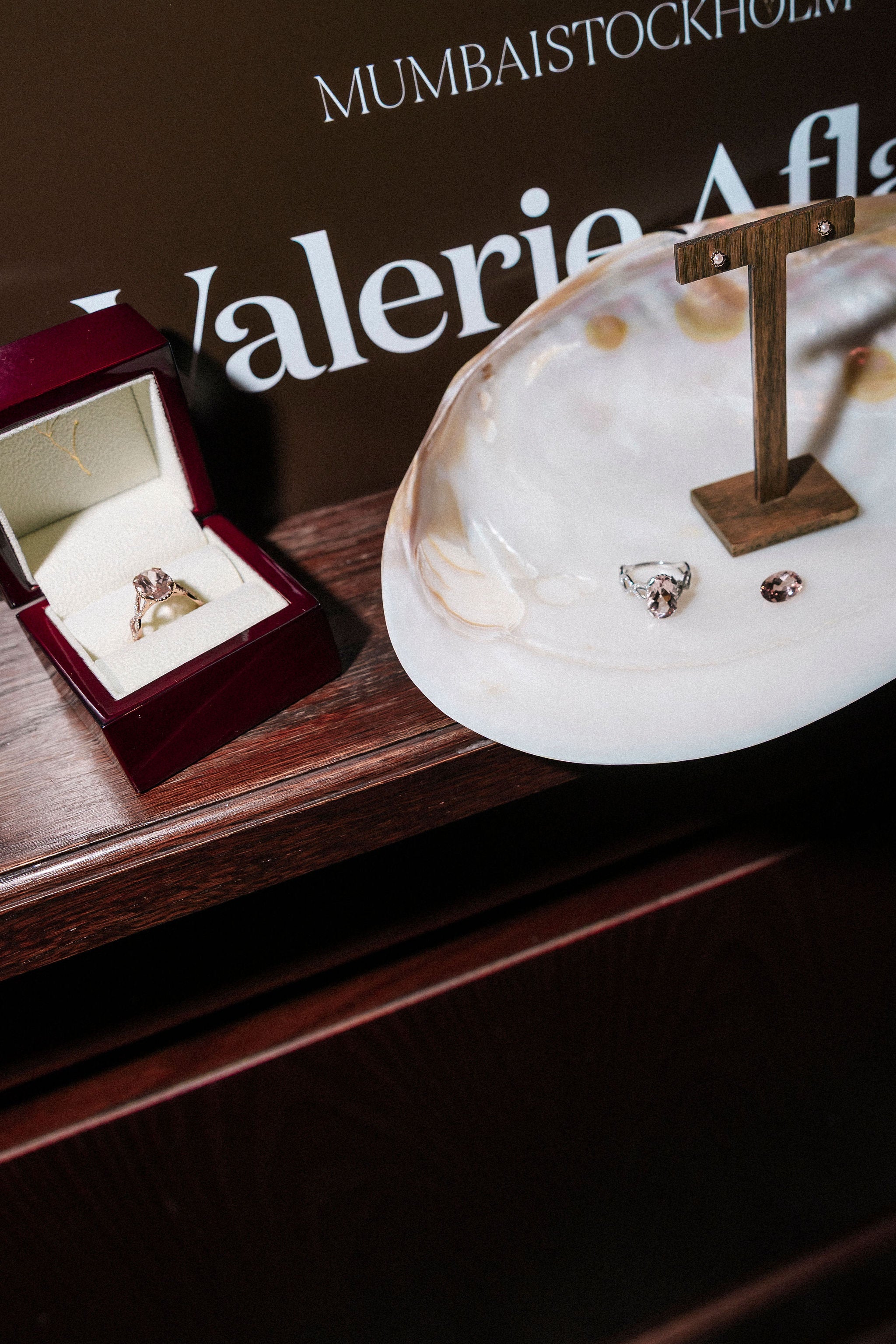 Kollektionen består av tre unika smycken: en ikonisk cocktailring med en varm, champagnerosa morganit i centrum, ett matchande örhänge samt en soiréering – alla med designinslag som för tankarna till havets vågor och Valeries signatursymbol: snäckan. Samtliga smycken tillverkas i 18K återvunnet guld i gult, vitt eller rosé.