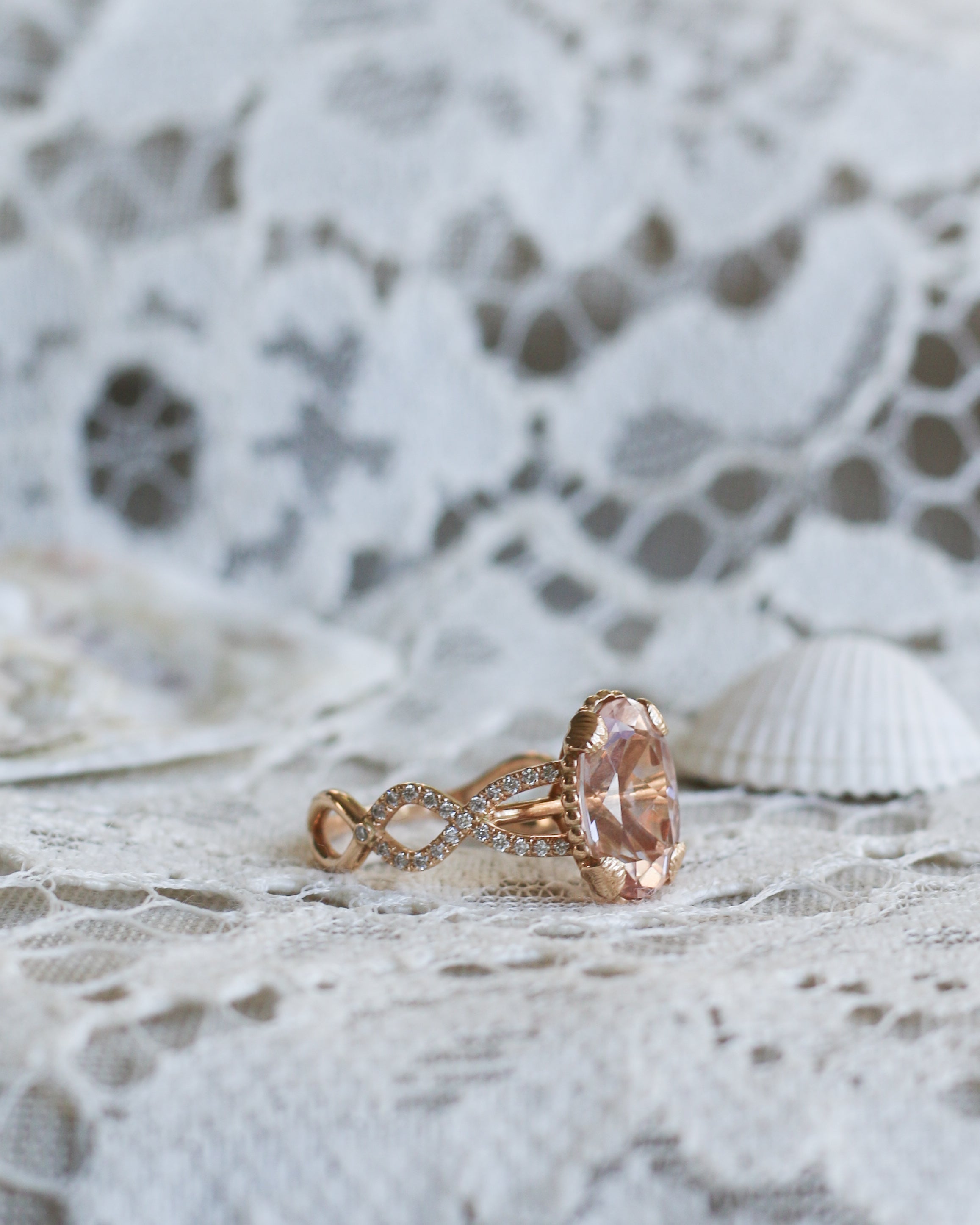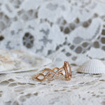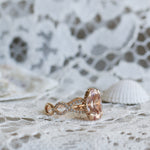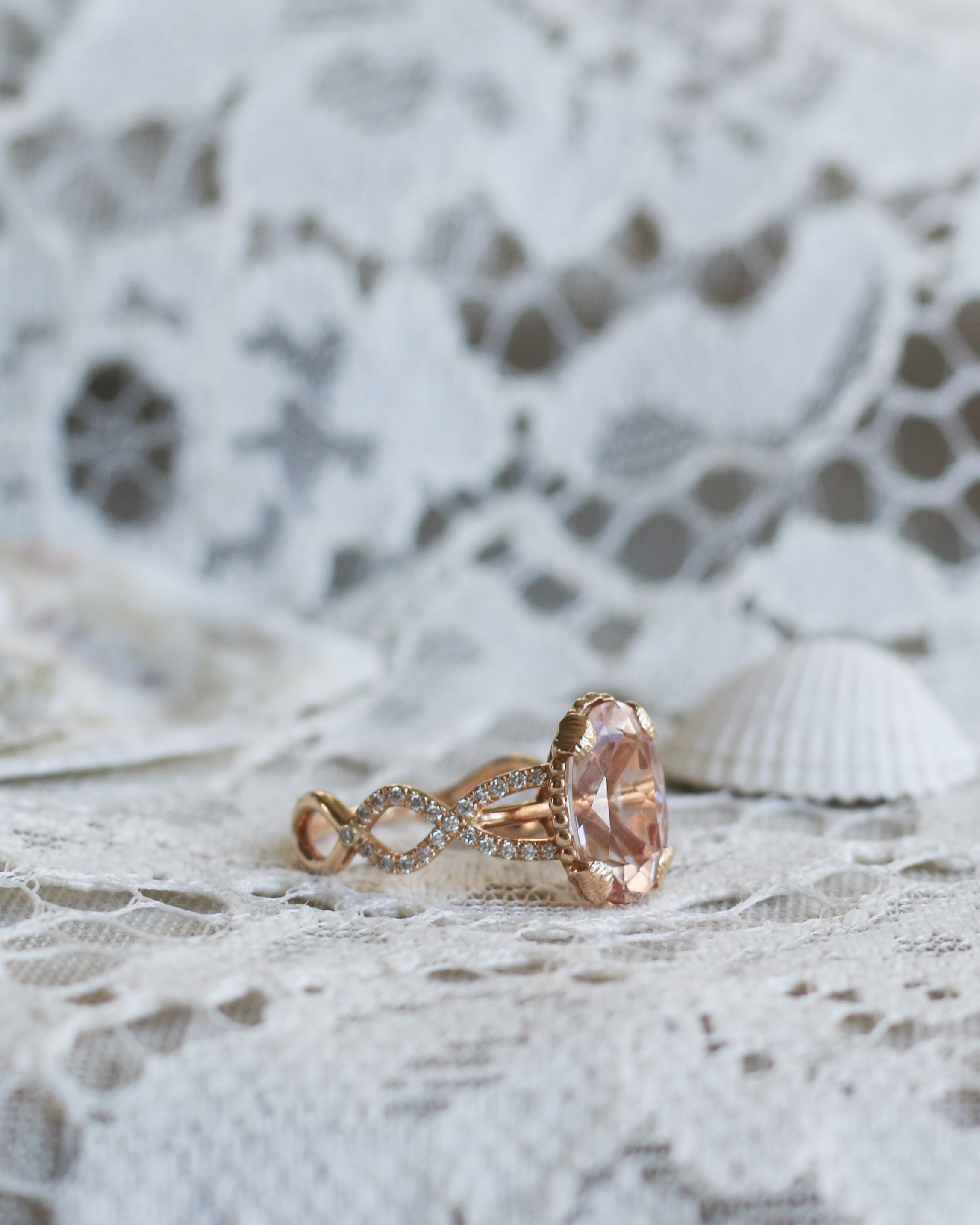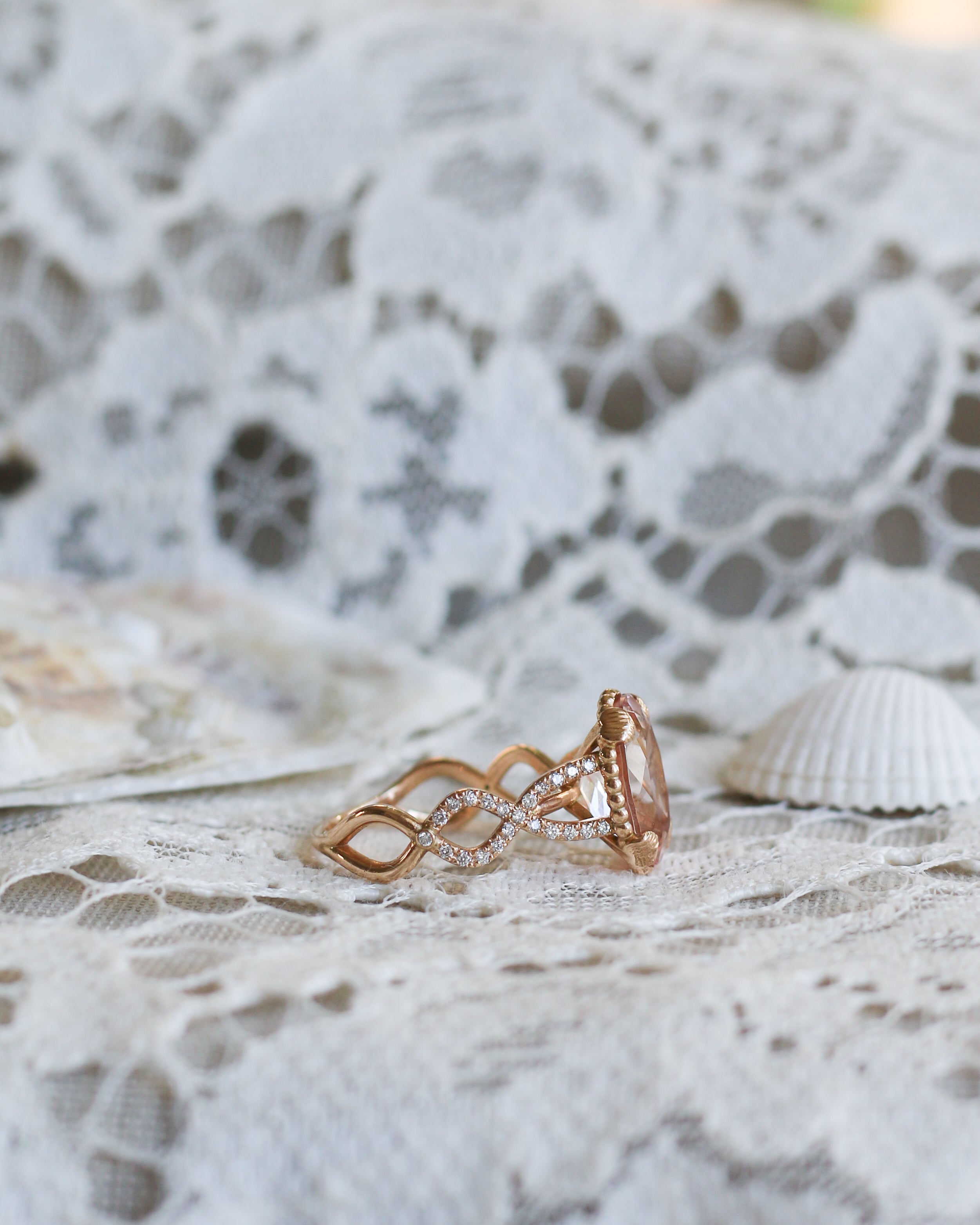 En helt underbar cocktailring inspirerad av havets vågor och strandens snäckor. I centrum skimrar en drygt 3 carat champagnemorganit omgiven av vågor av diamanter.