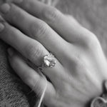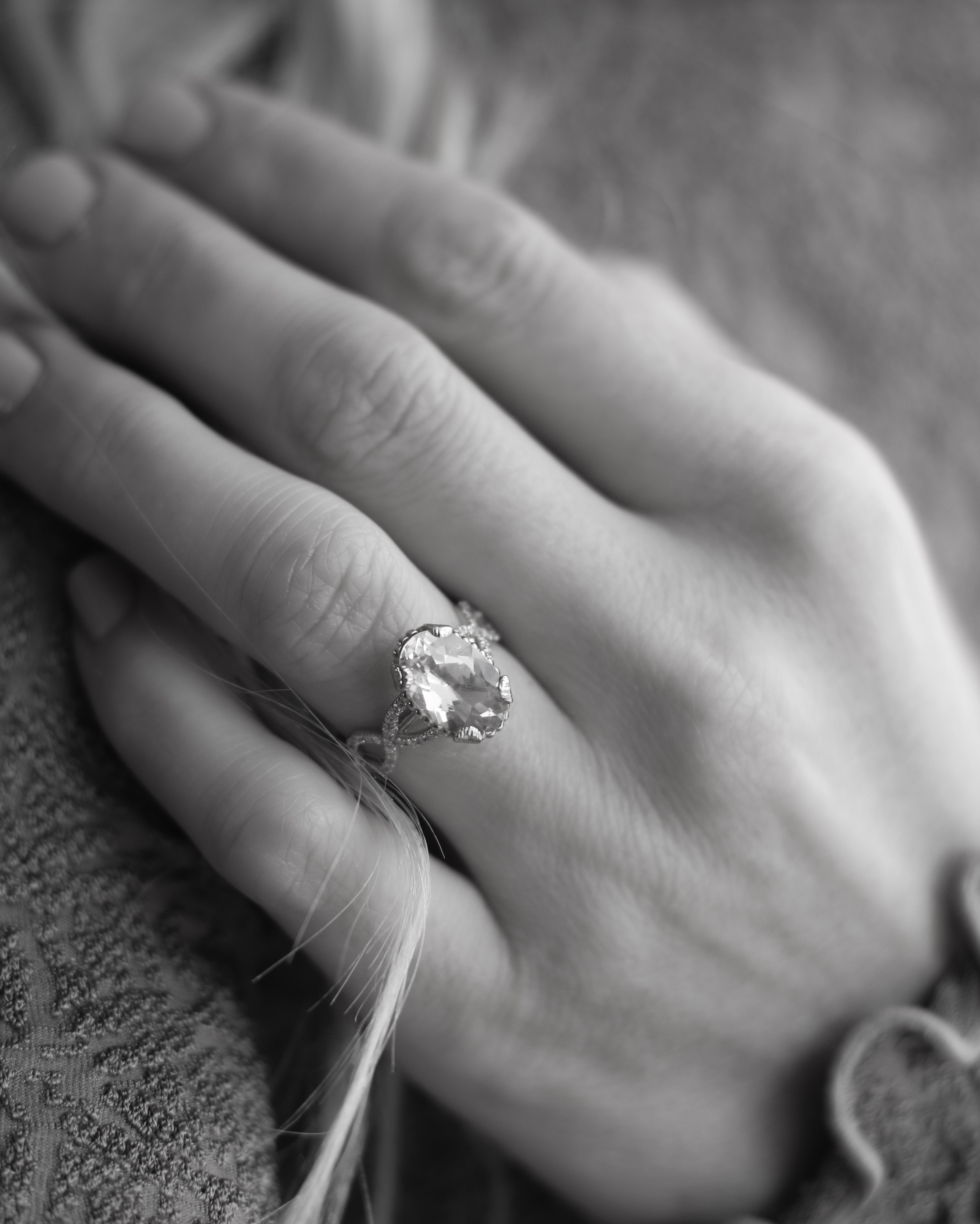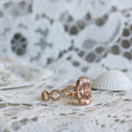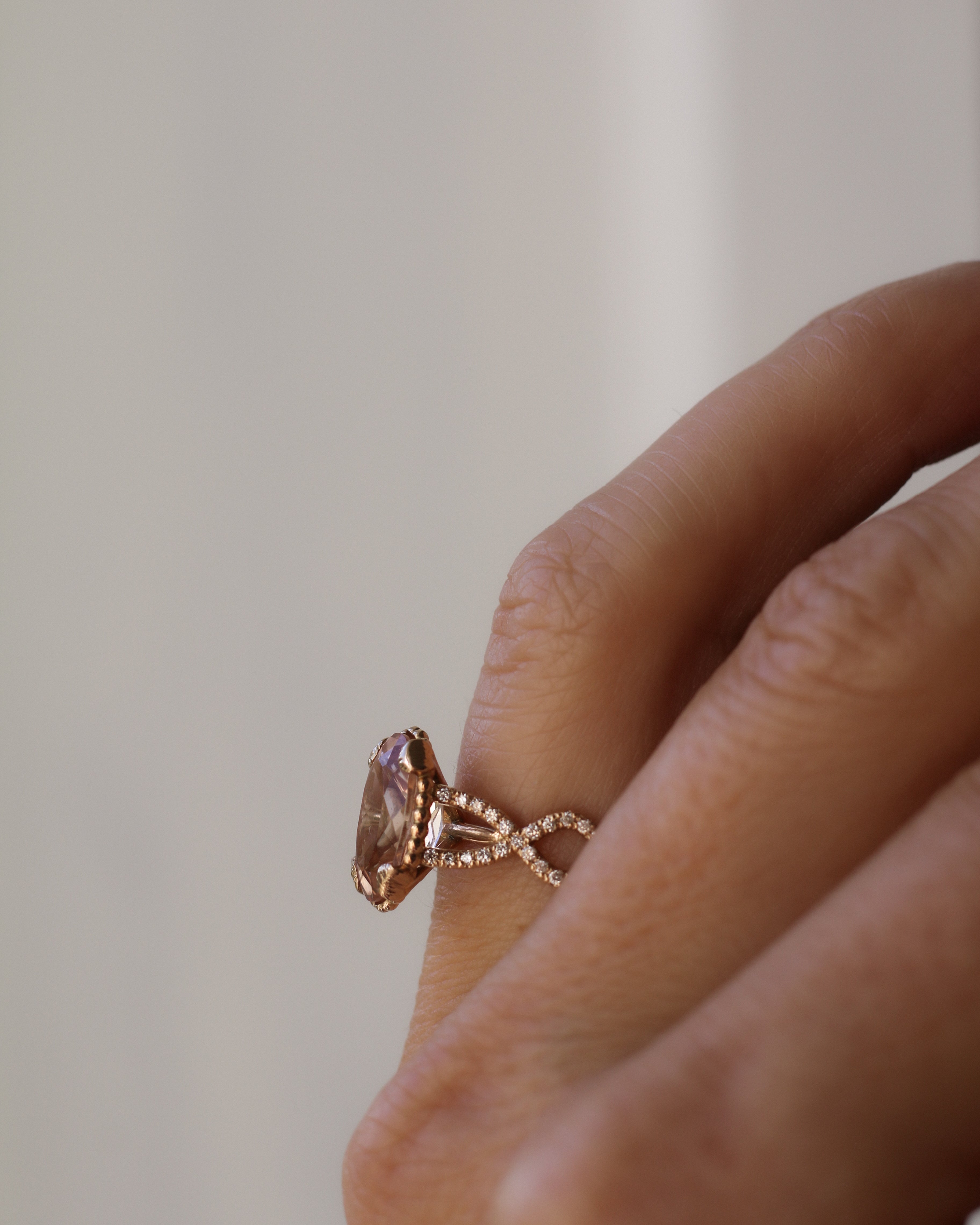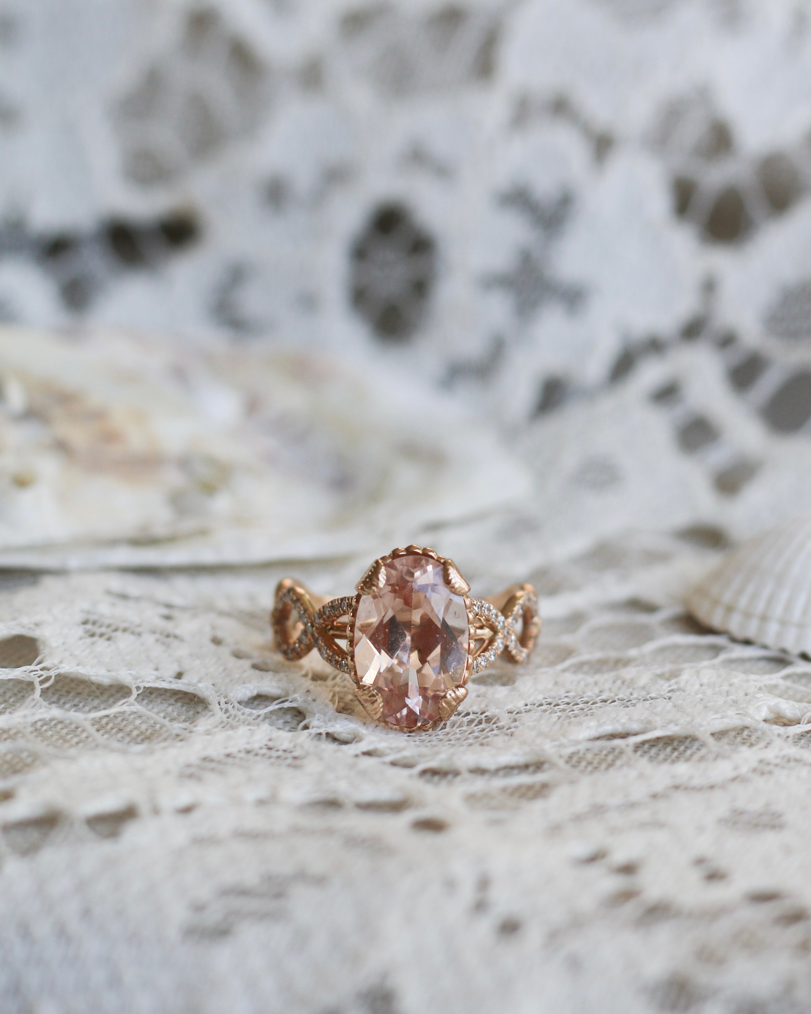 En helt underbar cocktailring inspirerad av havets vågor och strandens snäckor. I centrum skimrar en drygt 3 carat champagnemorganit omgiven av vågor av diamanter.