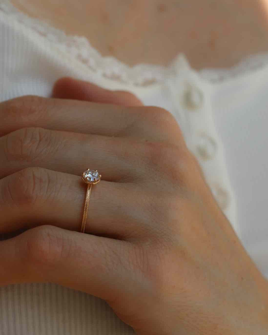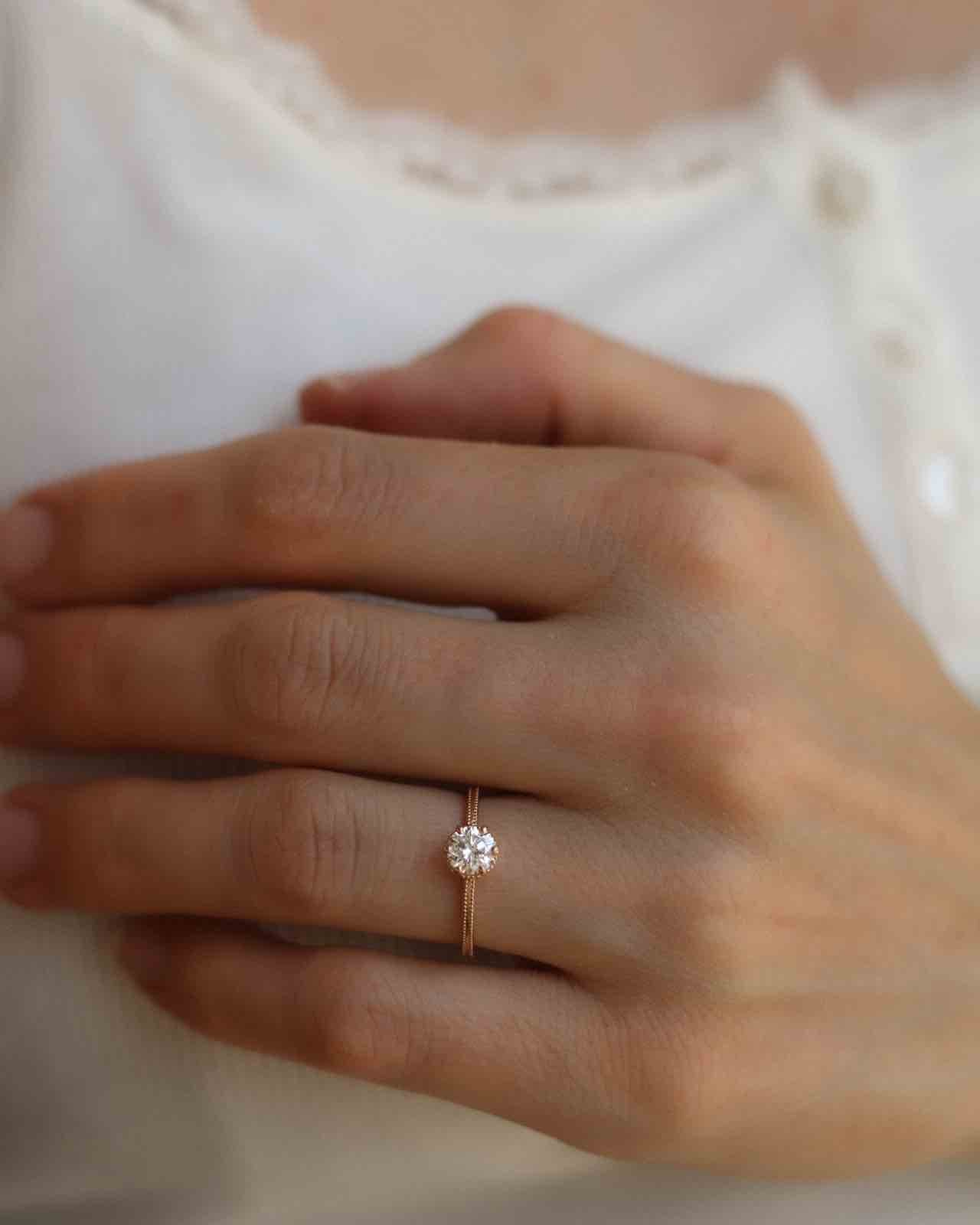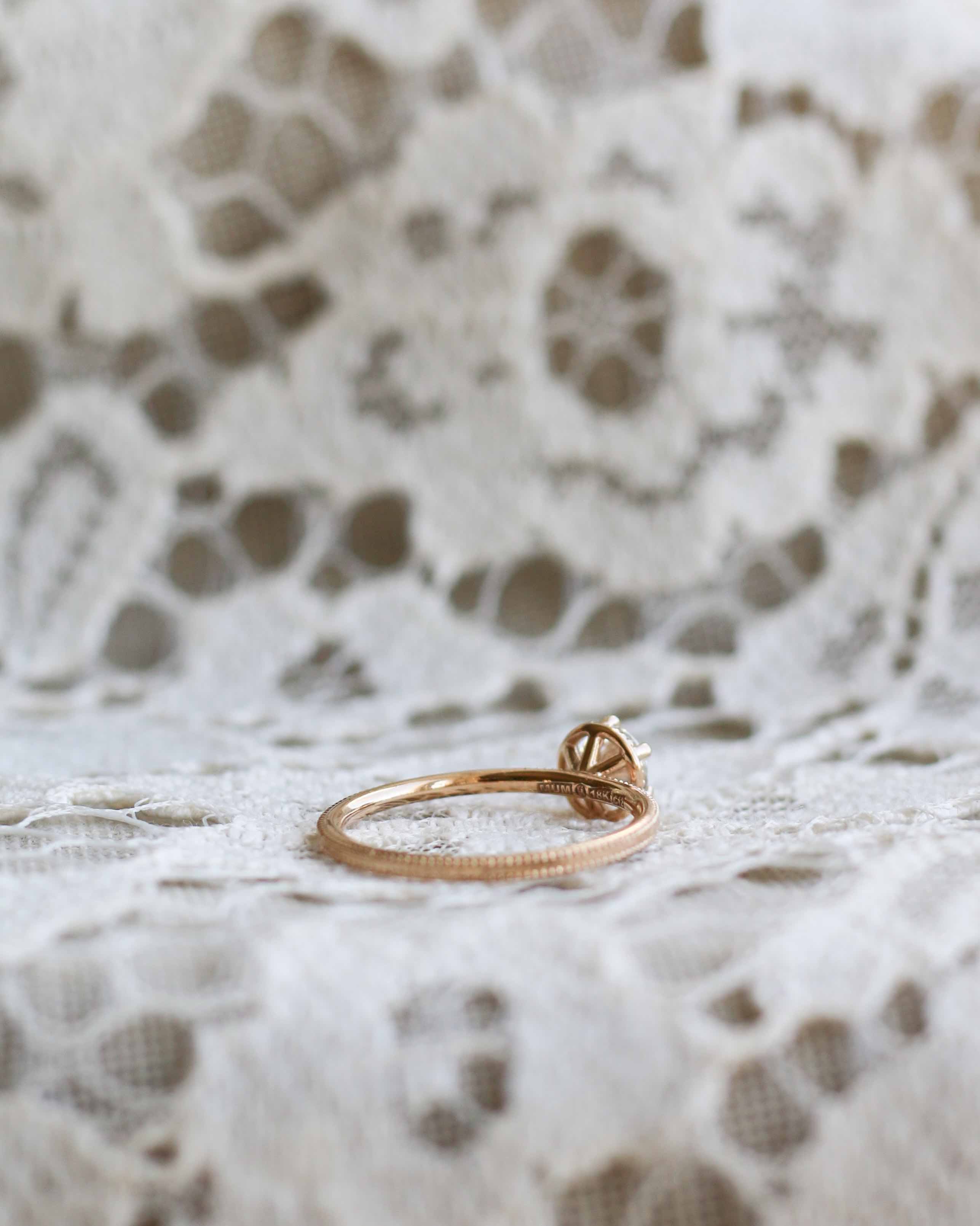 En galet vacker solitärring i gammeldags stil med en modern, briljantslipad diamant. (Om du hellre önskar en antikdiamant i din ring, hittar du dem här)